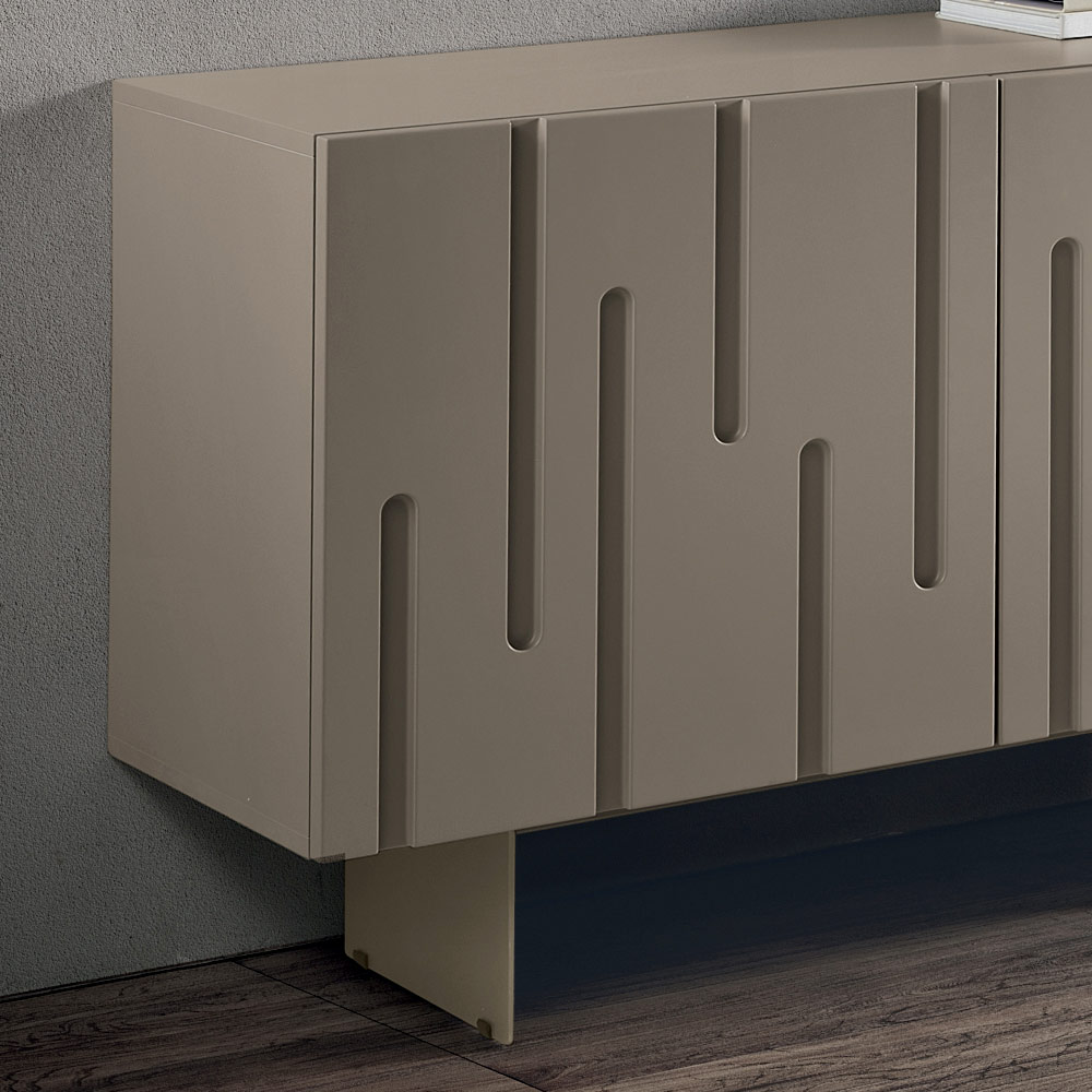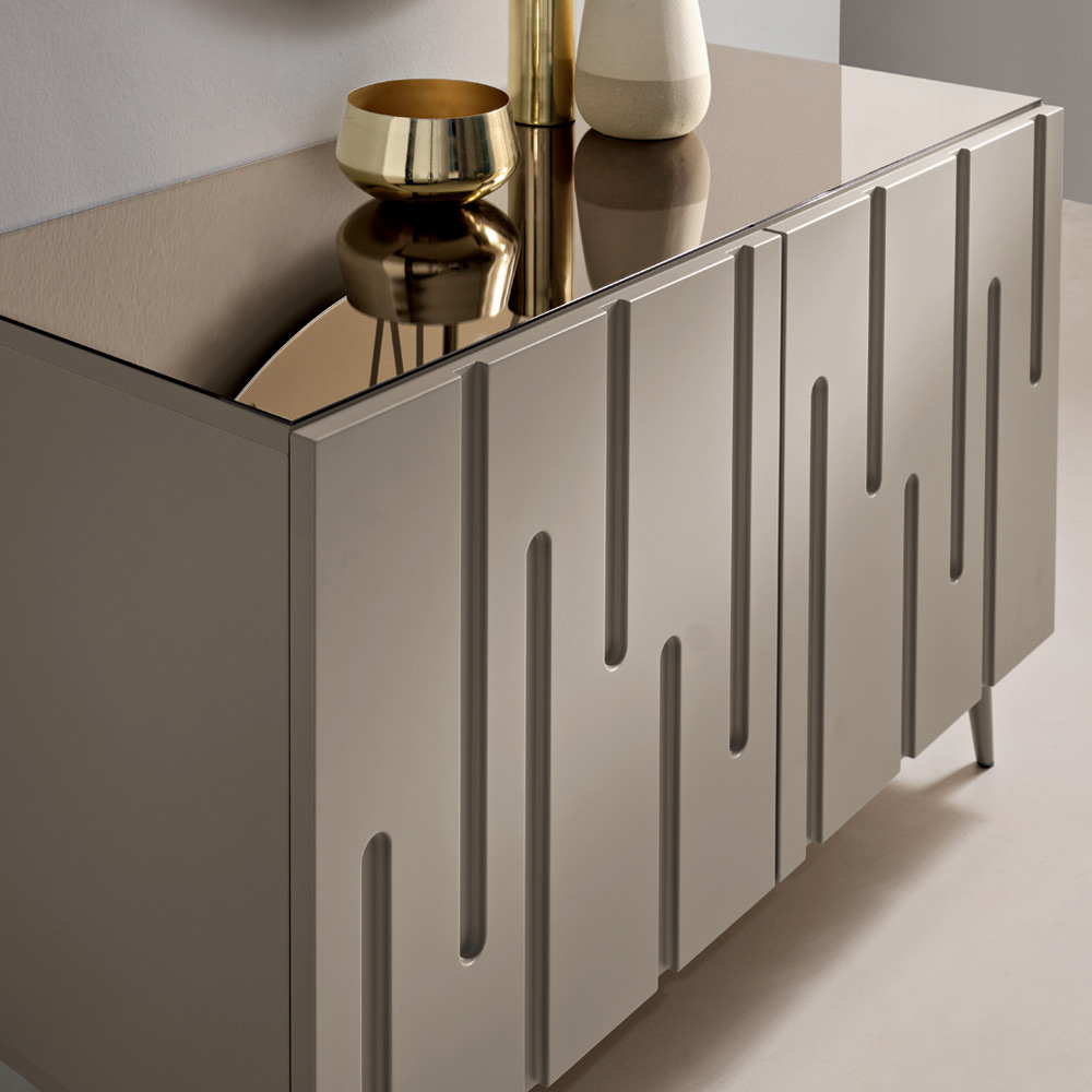 As portas em MDF revestidas com PVC apresentam incisões verticais irregulares que remetem ao fluxo natural de estalactites e estalagmites , criando um efeito refinado, texturizado e dinâmico. Essa interação de relevos confere profundidade e movimento à superfície, realçando a luminosidade e tornando o aparador a peça central do ambiente.