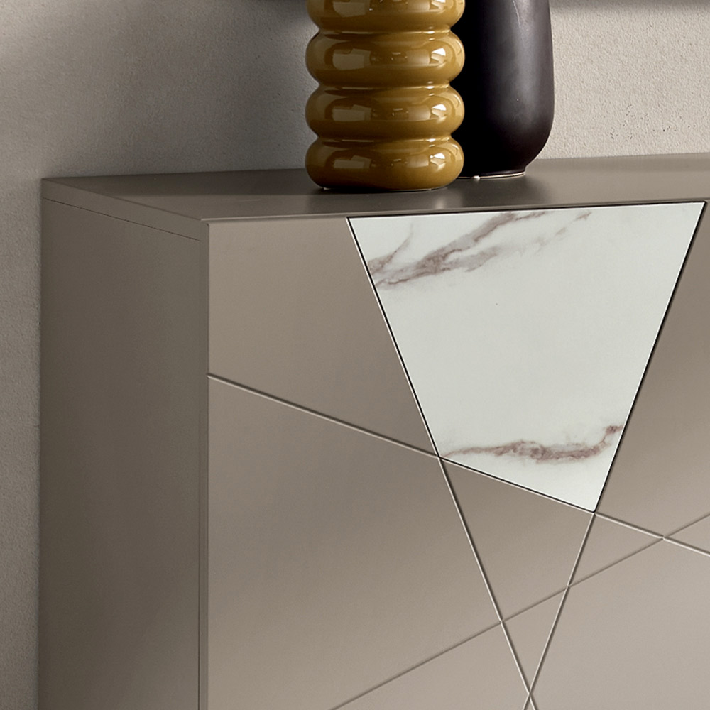 A estrutura é composta por uma moldura de madeira revestida com melamina e portas de MDF pantografadas , apresentando gravuras decorativas que se cruzam num elegante desenho geométrico. Os painéis de vidro com efeito mármore enriquecem a superfície, criando uma sofisticada interação entre elementos gráficos e materiais.