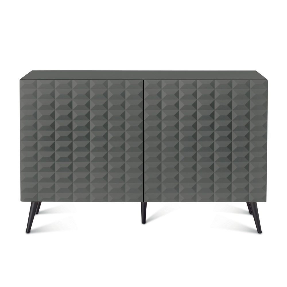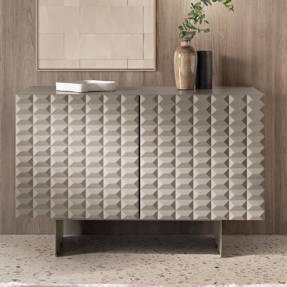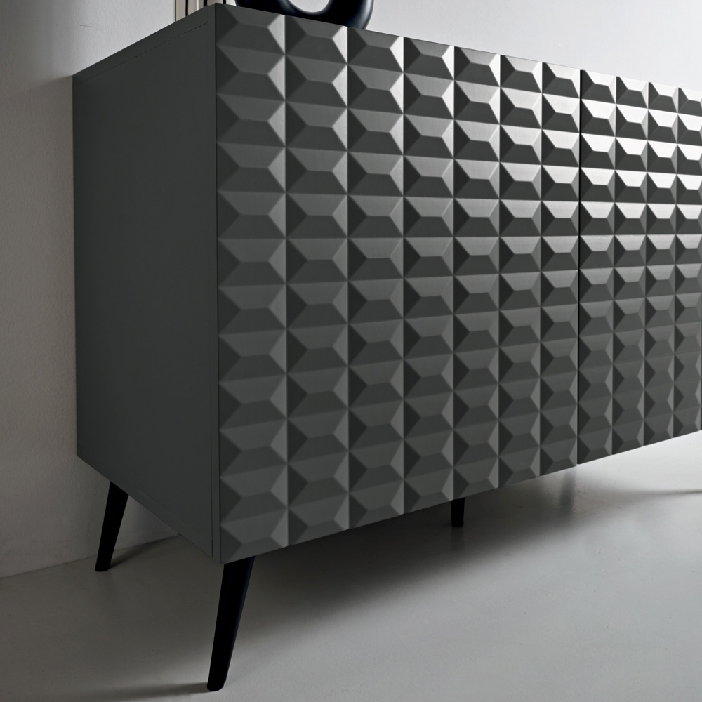 Aparador de design fabricado na Itália com portas tridimensionais em formato de diamante e base de metal.