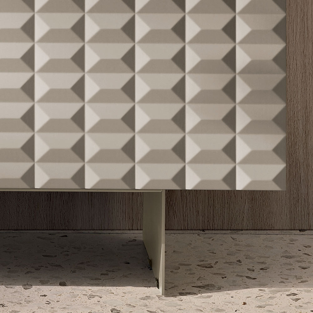 As portas em MDF revestidas com PVC apresentam uma textura geométrica tridimensional que evoca os famosos relevos em forma de diamante , criando um fascinante jogo de luz e sombra. Este detalhe confere profundidade visual e transforma o aparador num verdadeiro ponto focal da divisão.