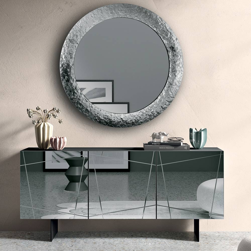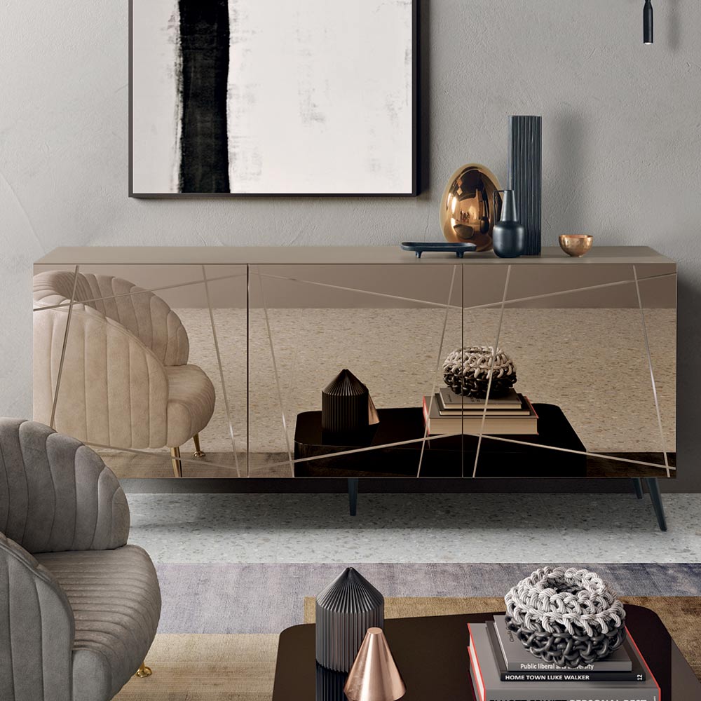 A estrutura em melamina abriga portas revestidas em vidro espelhado bronze ou fumê , adornadas com gravuras decorativas que se entrelaçam num elegante design gráfico. Este detalhe realça a superfície refletora, criando uma interação refinada de luz e profundidade.