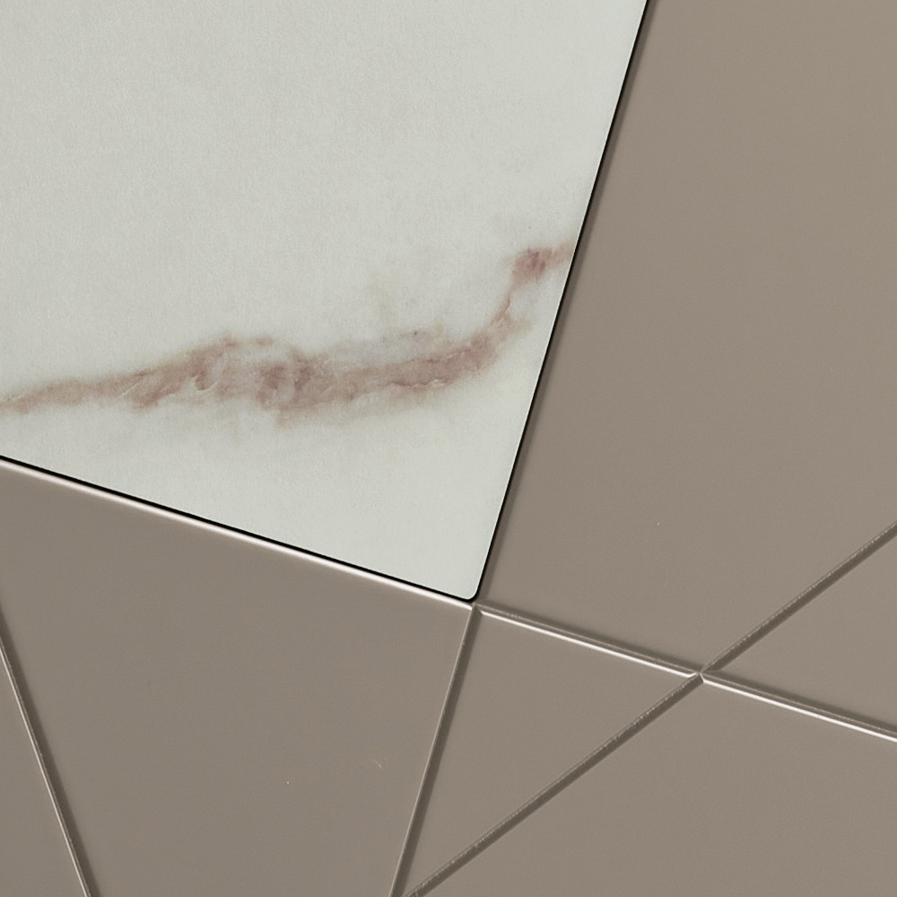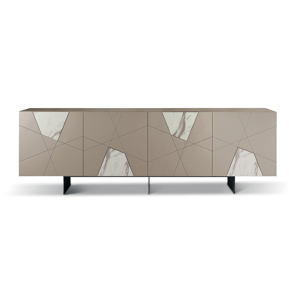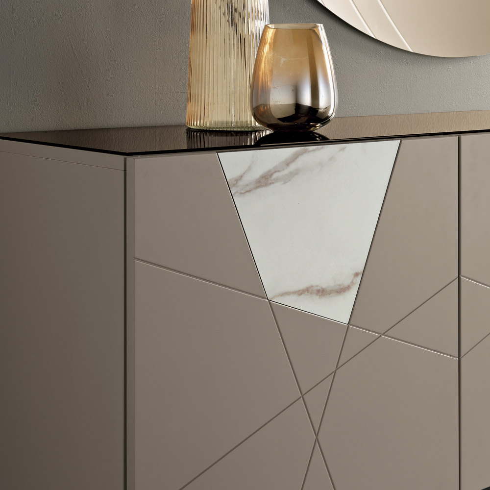 A estrutura é composta por uma camada externa de madeira revestida com melamina, um tampo de vidro espelhado e portas de MDF pantografadas, apresentando gravuras decorativas que se entrelaçam num elegante desenho geométrico. Inserções de vidro com efeito mármore enriquecem a superfície, criando uma sofisticada interação entre elementos gráficos e materiais.