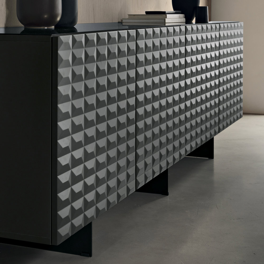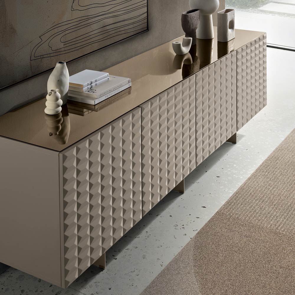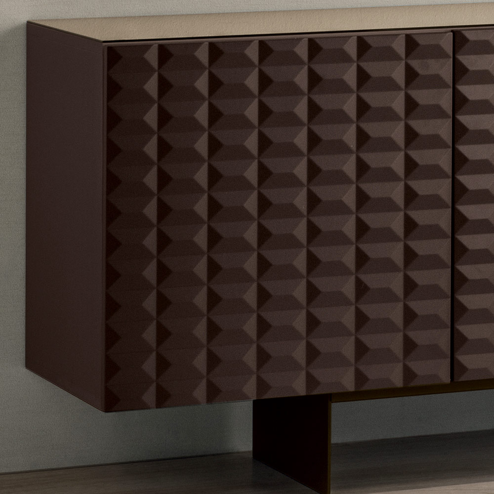 As portas em MDF revestidas com PVC apresentam uma textura geométrica tridimensional que evoca os famosos relevos em forma de diamante , criando um fascinante jogo de luz e sombra. Este detalhe confere profundidade visual e transforma o aparador num verdadeiro ponto focal da divisão.