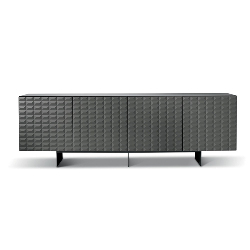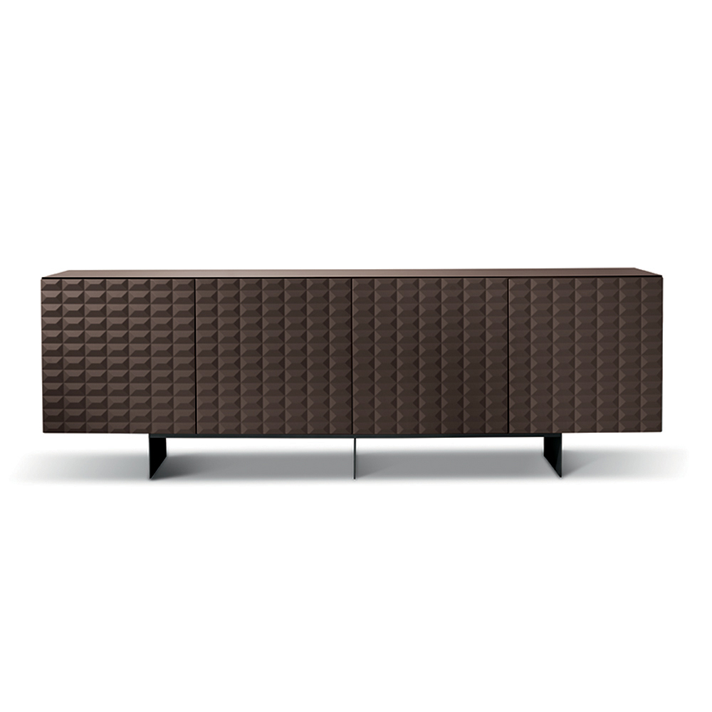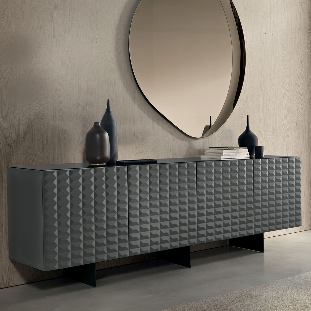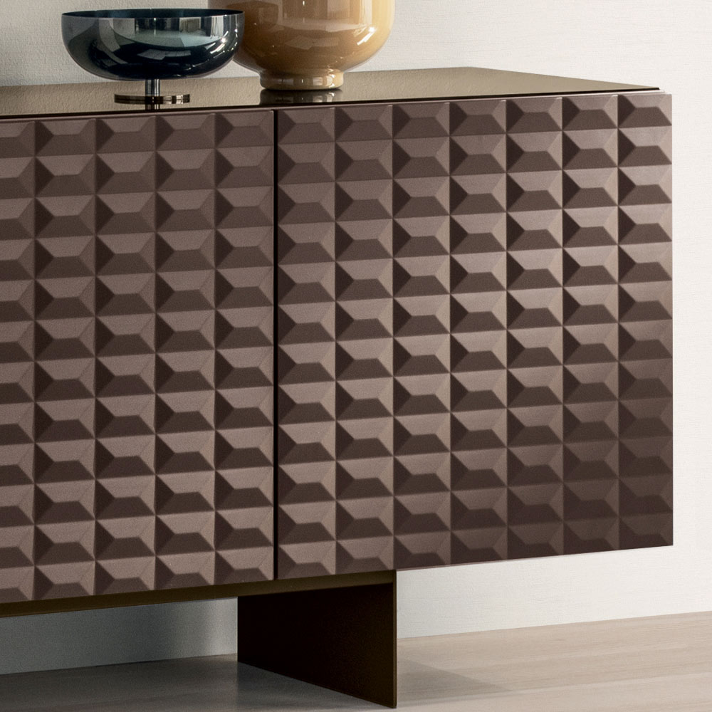 As portas em MDF revestidas com PVC apresentam uma textura geométrica tridimensional que evoca os famosos relevos em forma de diamante , criando um fascinante jogo de luz e sombra. Este detalhe confere profundidade visual e transforma o aparador num verdadeiro ponto focal da divisão.