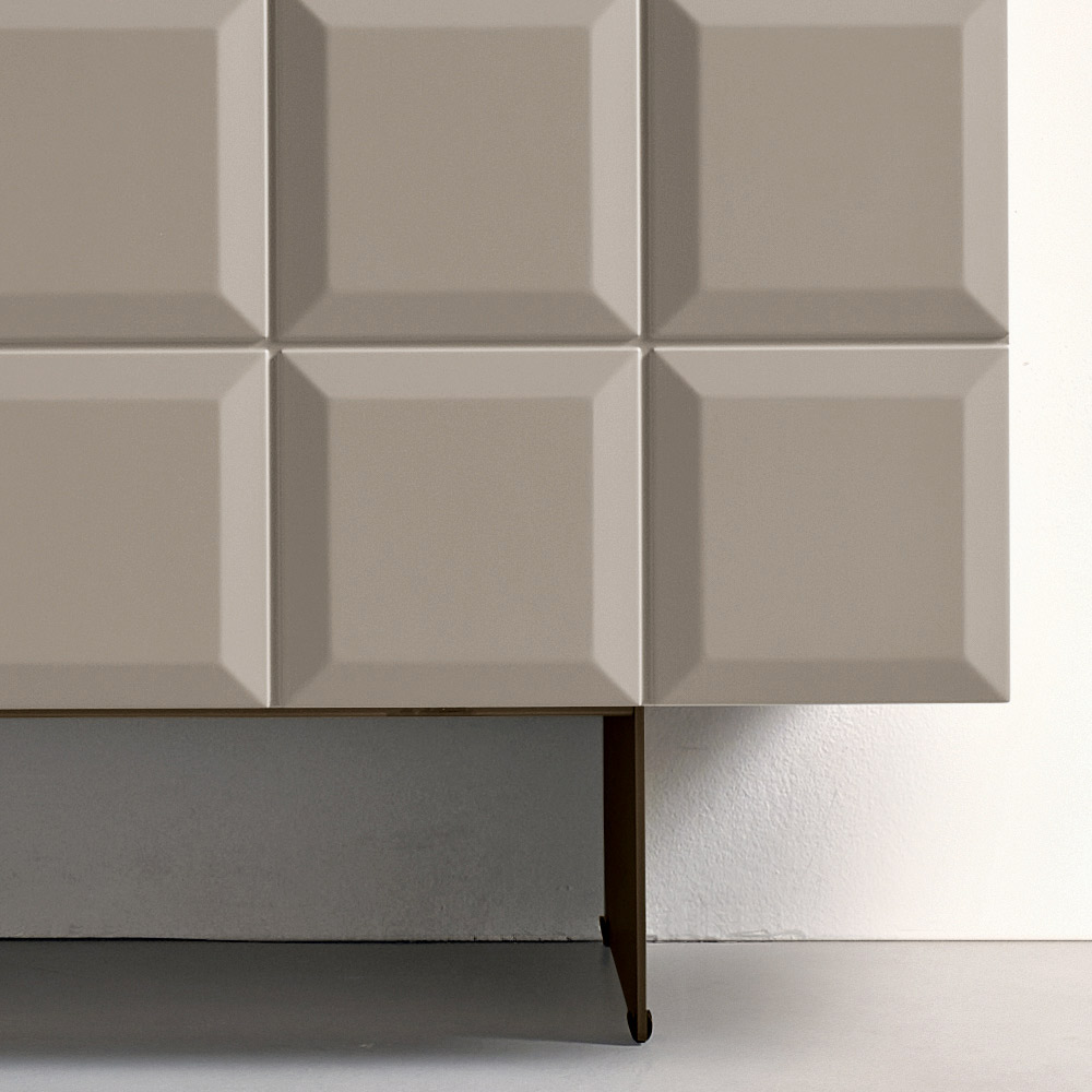 Aparador de design fabricado na Itália com portas geométricas em relevo e base de metal.