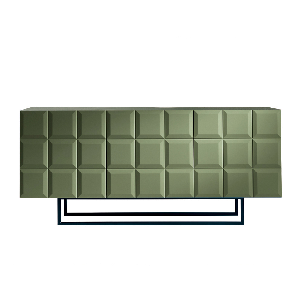 Aparador de design fabricado na Itália com portas geométricas em relevo e base de metal.