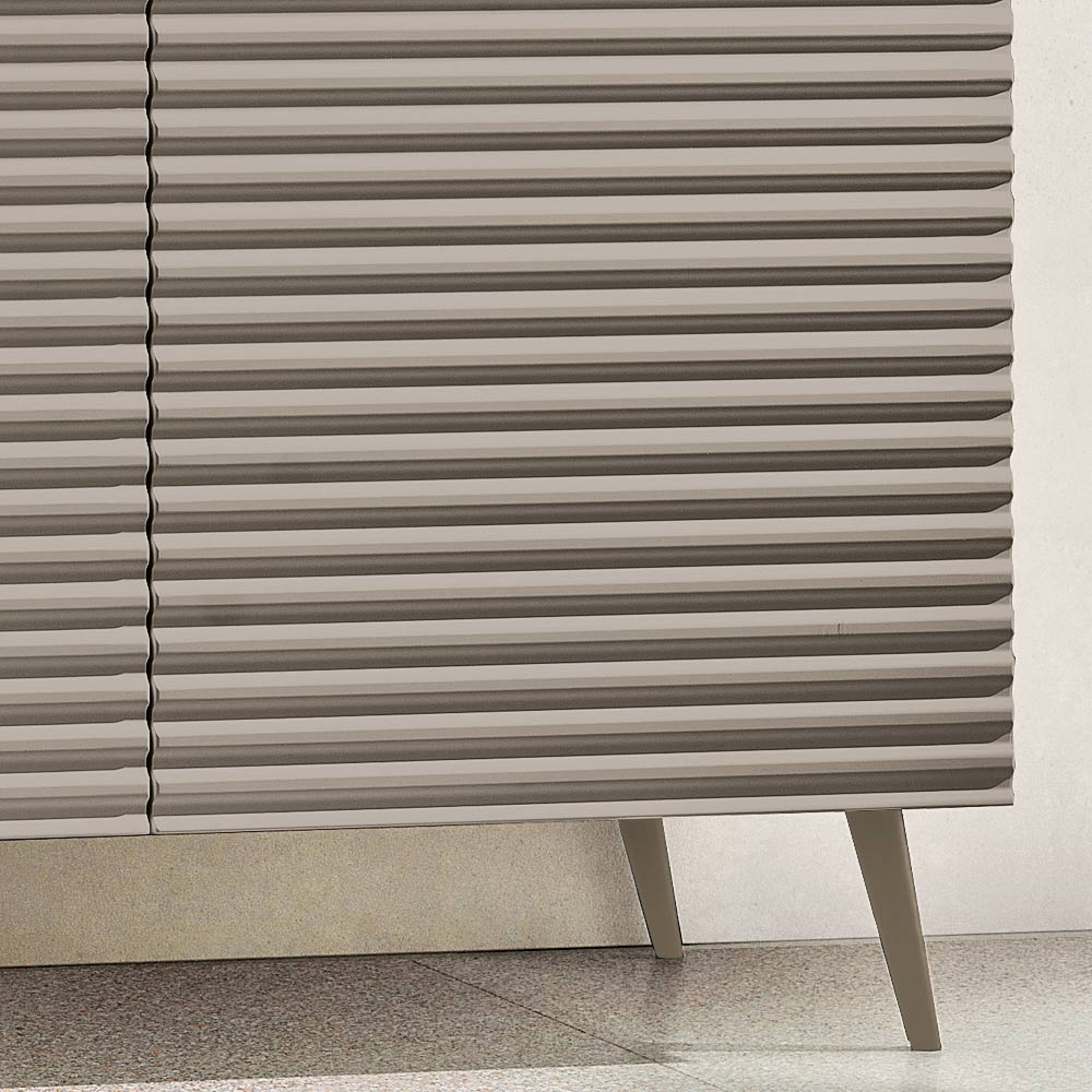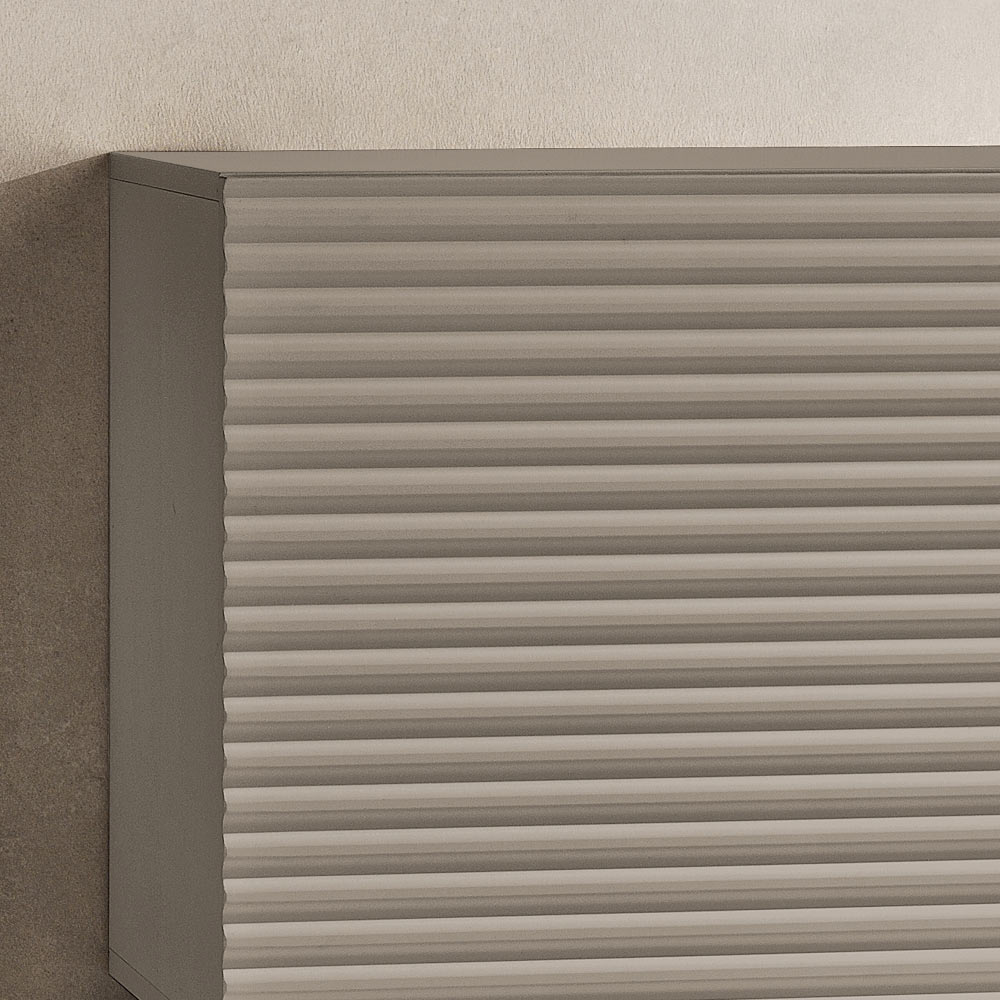 As portas em MDF revestidas com PVC apresentam um design de listras horizontais em relevo que adiciona profundidade e movimento à superfície, criando um elegante efeito gráfico. O corpo em melamina, em consonância com o restante da porta, completa o design com um refinado efeito tom sobre tom , tornando a composição harmoniosa e moderna.