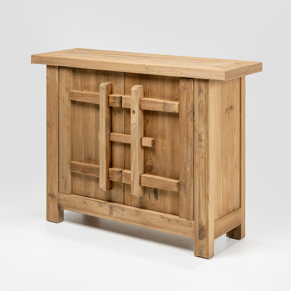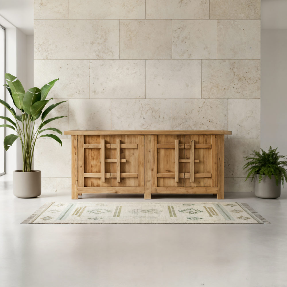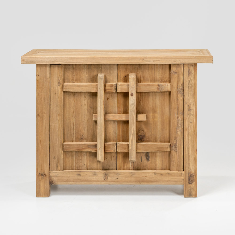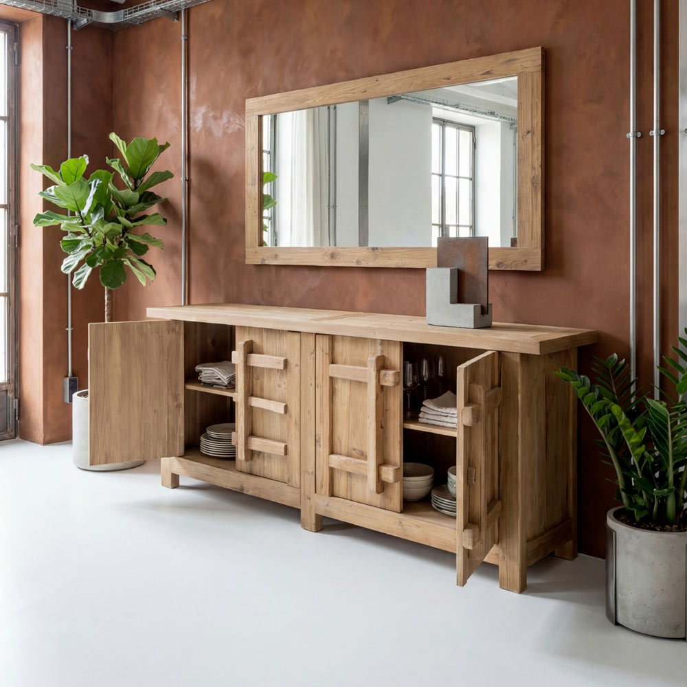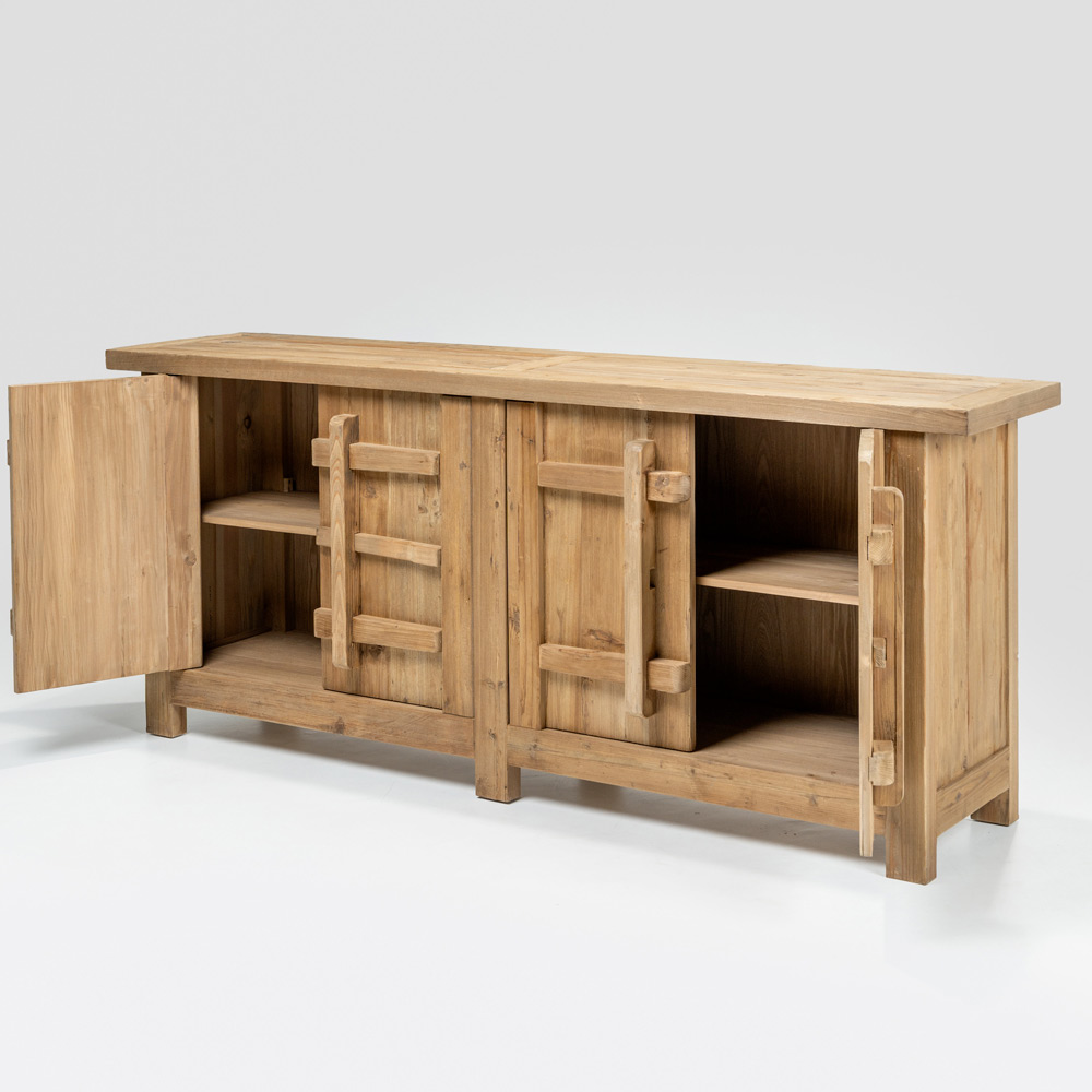 Este aparador em pinho natural envelhecido é uma peça com um caráter autêntico e texturizado, ideal para espaços rústicos, campestres ou de estilo natural. O acabamento envelhecido realça os veios da madeira e suas imperfeições, tornando cada peça única e cheia de personalidade.