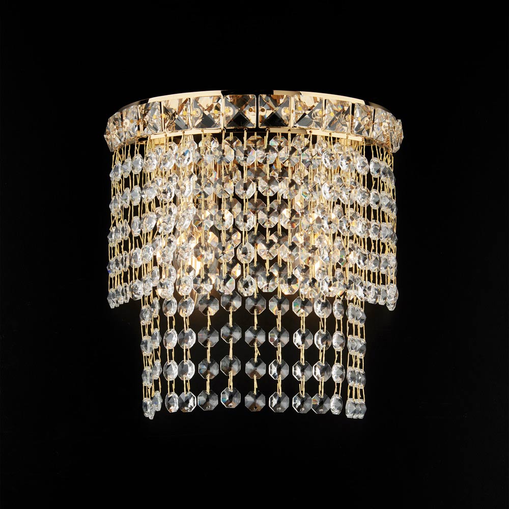 Elegante e deslumbrante, este aplique de parede de luxo em ferro e latão banhado a ouro com strass é um elemento de iluminação refinado, concebido para embelezar paredes com uma luz quente e envolvente. A estrutura compacta, adornada com cascatas de strass luminosos , cria um jogo de reflexos sugestivo que confere ao ambiente uma atmosfera sofisticada e encantadora.
