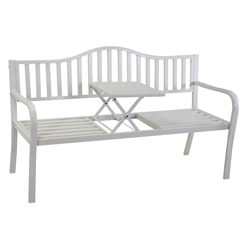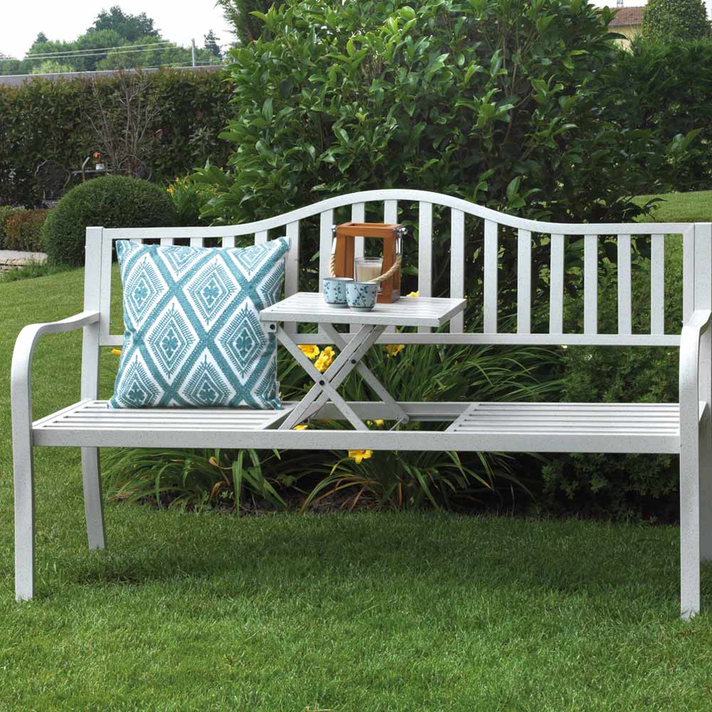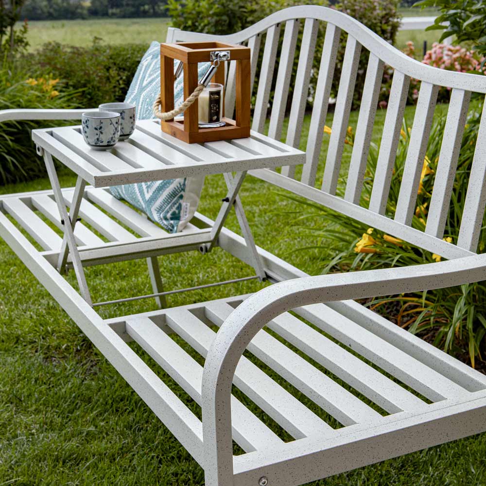 O acabamento branco combina facilmente com qualquer ambiente externo, adicionando um toque de estilo contemporâneo. O destaque desta peça é a mesa dobrável , perfeita para guardar bebidas, livros ou pequenos itens, transformando o banco num conveniente espaço multifuncional em segundos.