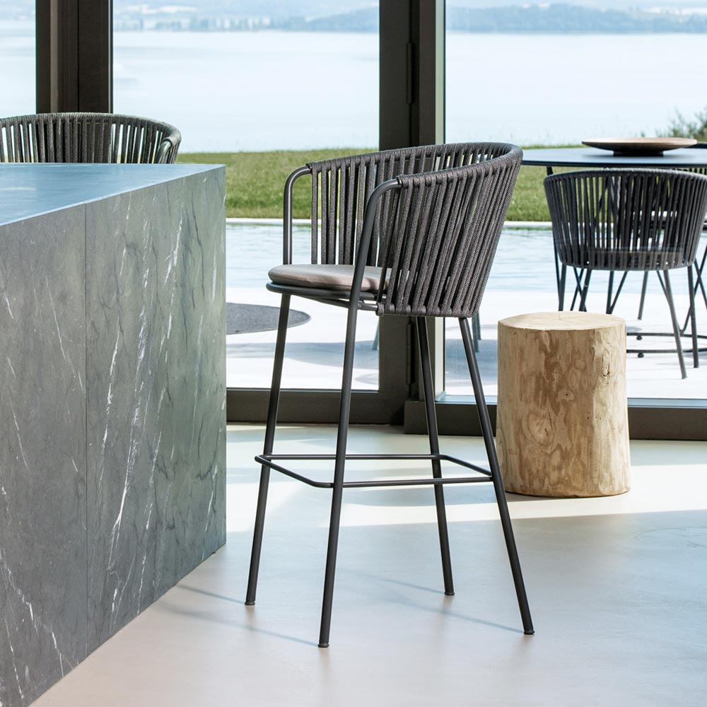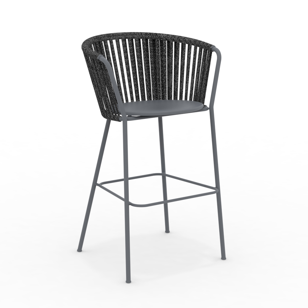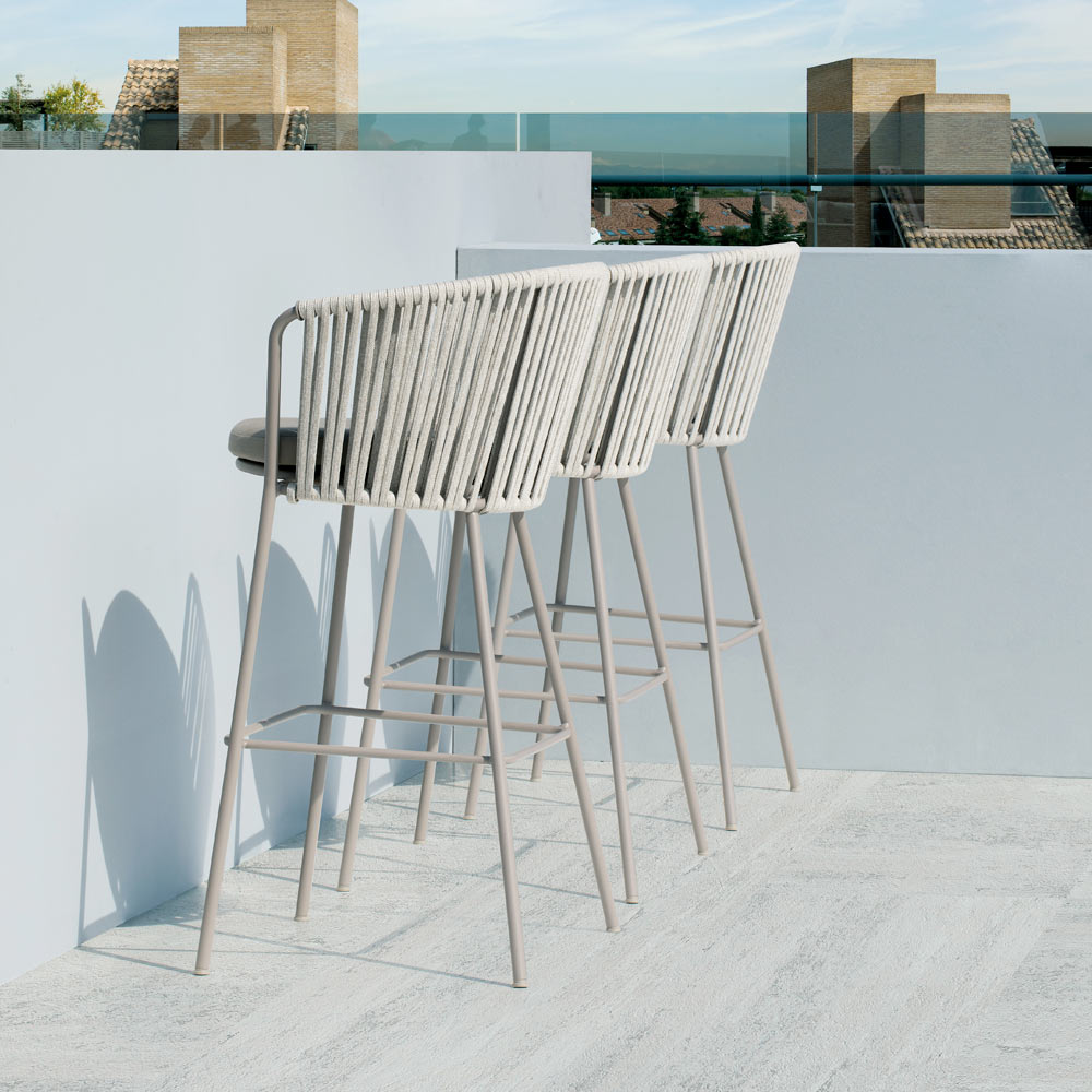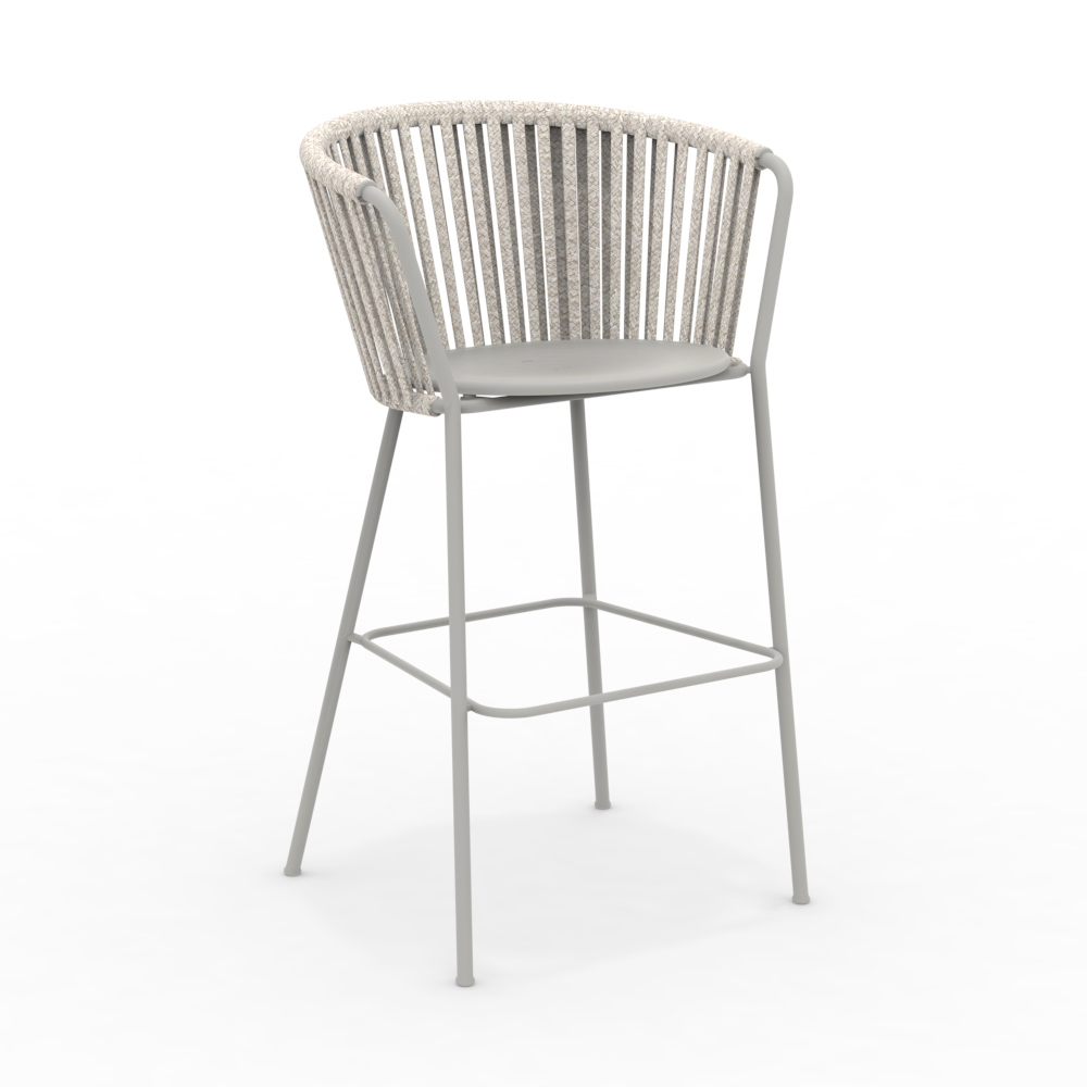 A estrutura em aço inoxidável garante solidez e resistência aos agentes atmosféricos, enquanto a trama em corda confere um toque de leveza e requinte, envolvendo o assento em um abraço confortável. O design ergonômico e as linhas arredondadas garantem uma experiência de assento agradável e relaxante.