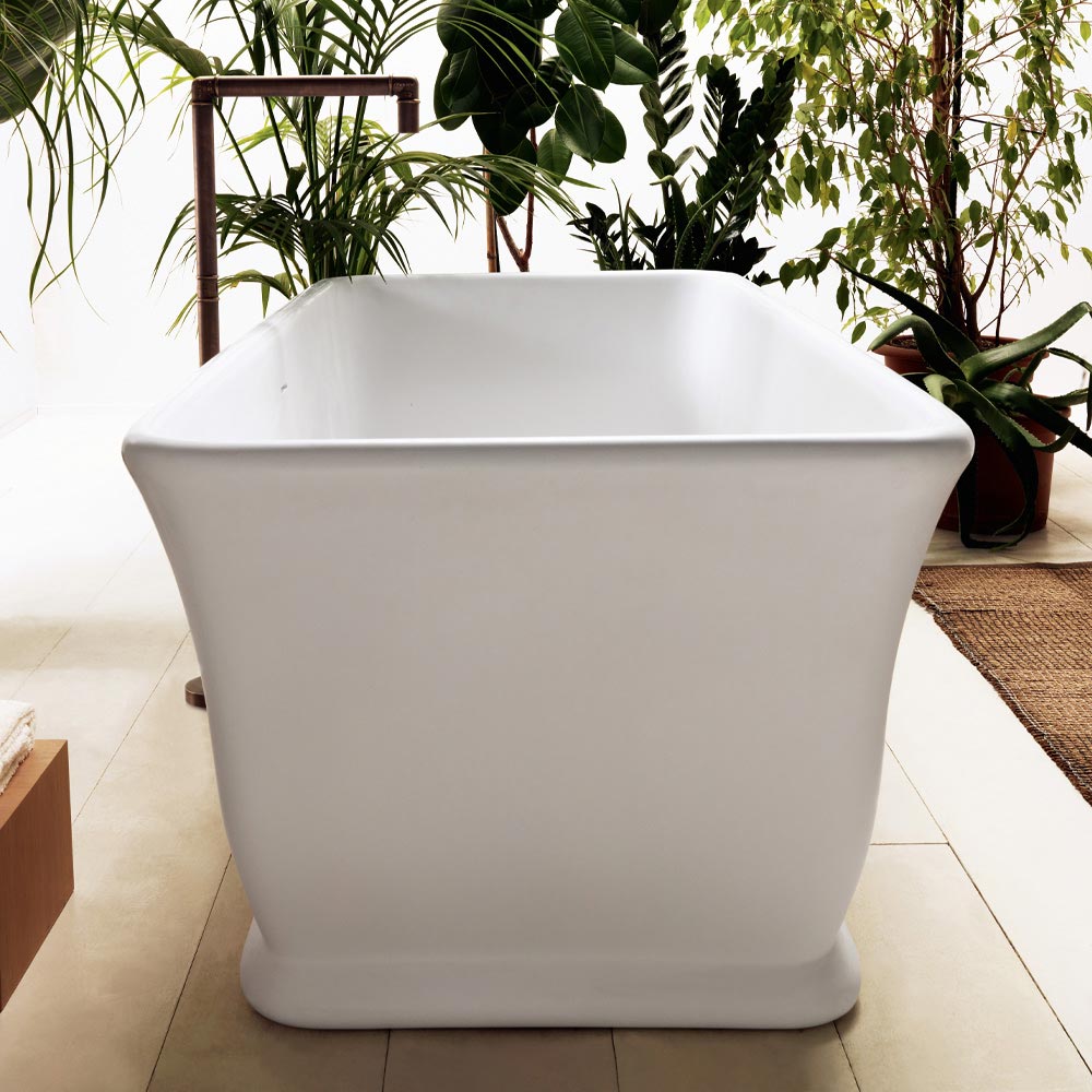 Banheira branca em Solid Surface , mistura de resina acrílica modificada com compostos minerais, com transbordo integrado . Banheira dedicada aos amantes da tradicional banheira com pés de garra. Opção de branco fosco ou brilhante . A mistura da composição permite que essa cor característica saia. Esta mistura também é altamente renovável, homogênea e 100% não porosa e, portanto, à prova d'água.