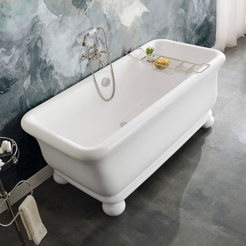 Banheira retangular branca em Solid Surface, mistura de resina acrílica modificada com compostos minerais, com transbordo para coluna de esgoto. Banheira elevada original de 4 pés em superfície sólida opcional. Opção de branco fosco ou brilhante .