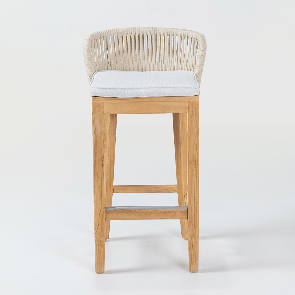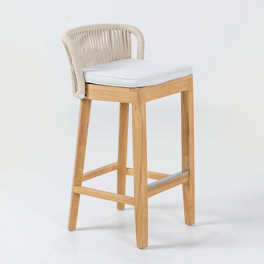 Elegante e versátil, este banco de bar possui uma estrutura em madeira teca natural e alumínio , garantindo a combinação perfeita de resistência e leveza . A almofada em tecido cinza Havana oferece excelente conforto, enquanto o trançado em corda de olefina/PP não só adiciona um toque de sofisticação , como também é resistente às intempéries, tornando-o ideal tanto para uso interno quanto externo.