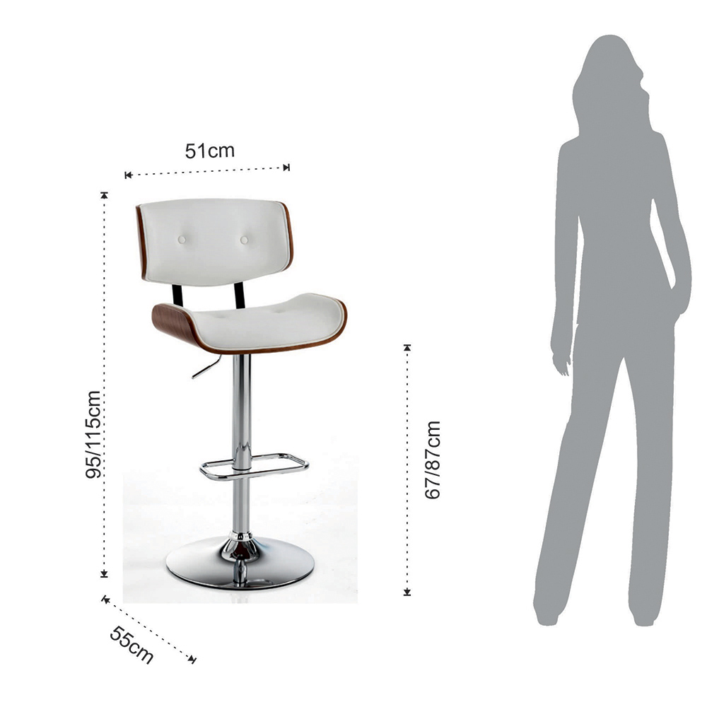 Banqueta alta de cozinha com base em metal cromado completo com prático apoio para os pés e assento e encosto em contraplacado manchado com acabamento em nogueira e pele sintética branca. A sua peculiaridade é representada pelo prático elevador a gás regulável que permite personalizar a altura do assento até um máximo de 87 cm. O seu design é único e cativante e é pontuado por formas suaves e linhas arredondadas que garantem um banco confortável e acolhedor, portanto ideal para completar ambientes domésticos como cozinhas ou salas de jantar mas também bares e restaurantes com um estilo moderno. A maravilhosa combinação do toque imponente da madeira com a elegância atemporal do couro dá vida a um complemento original e vanguardista com uma forte personalidade contemporânea .