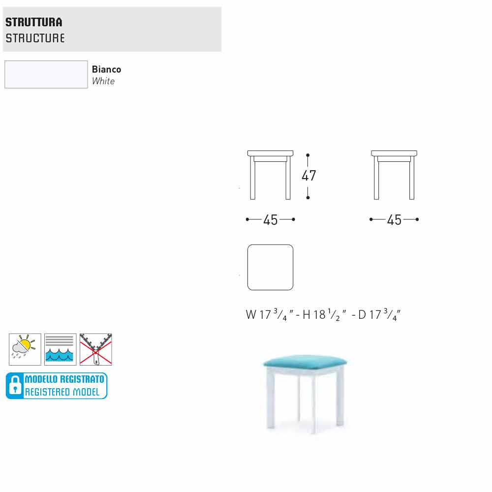 O sistema é um banquinho exterior encantador com uma estrutura de alumínio revestido a pó branco com assento de tecido estofado disponível em diferentes variantes de tecido.
