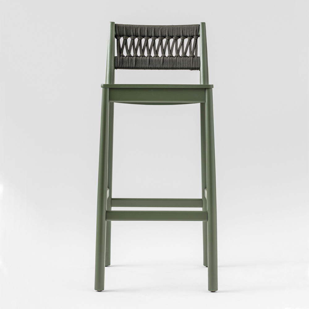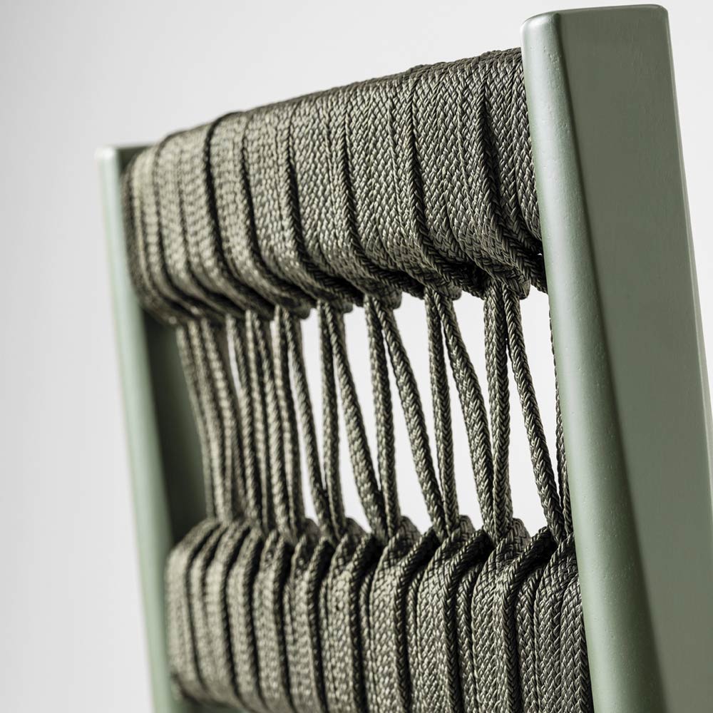 Banqueta alta made in Italy com estrutura em madeira de faia lacada e fundo em cordão verde militar. Simples, mas ao mesmo tempo original e criativo, este banquinho incorpora um design tradicional revisado para criar um produto inovador e moderno , características obtidas graças à peculiaridade da trama da corda que cobre todo o encosto para dar um aspecto novo e moderno. vanguarda. Graças ao acabamento discreto e sóbrio da estrutura, revela-se um assento extremamente versátil cuja personalidade é decidida pela cor escolhida para a corda, conseguindo oferecer soluções sóbrias e discretas ou extravagantes e coloridas.