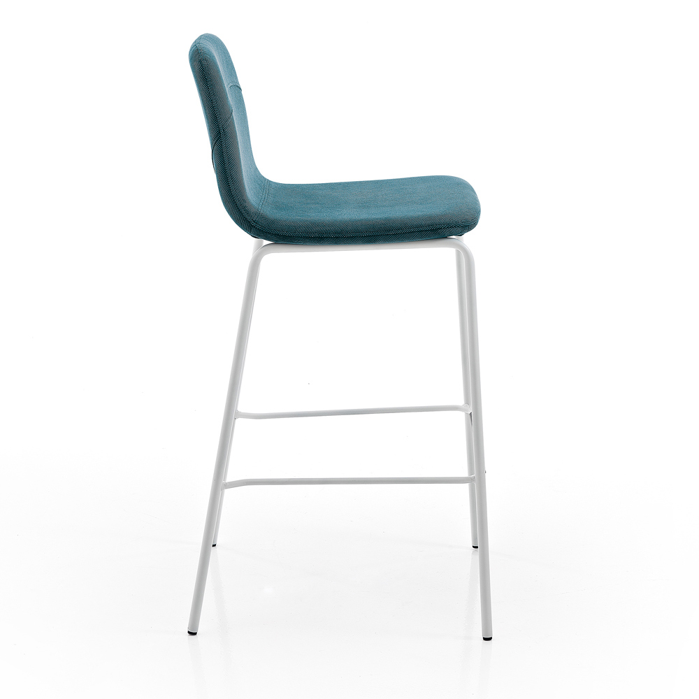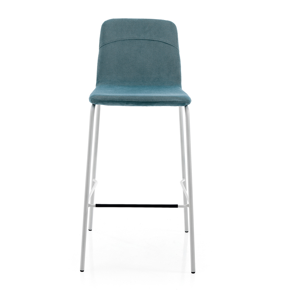 Banco alto de cozinha fabricado na Itália com estrutura metálica em tubo redondo (diâmetro 16 mm) completo com apoio de pés prático e assento revestido em tecido . Um design funcional e atemporal, indicado para quem deseja criar um ambiente acolhedor com tons delicados.