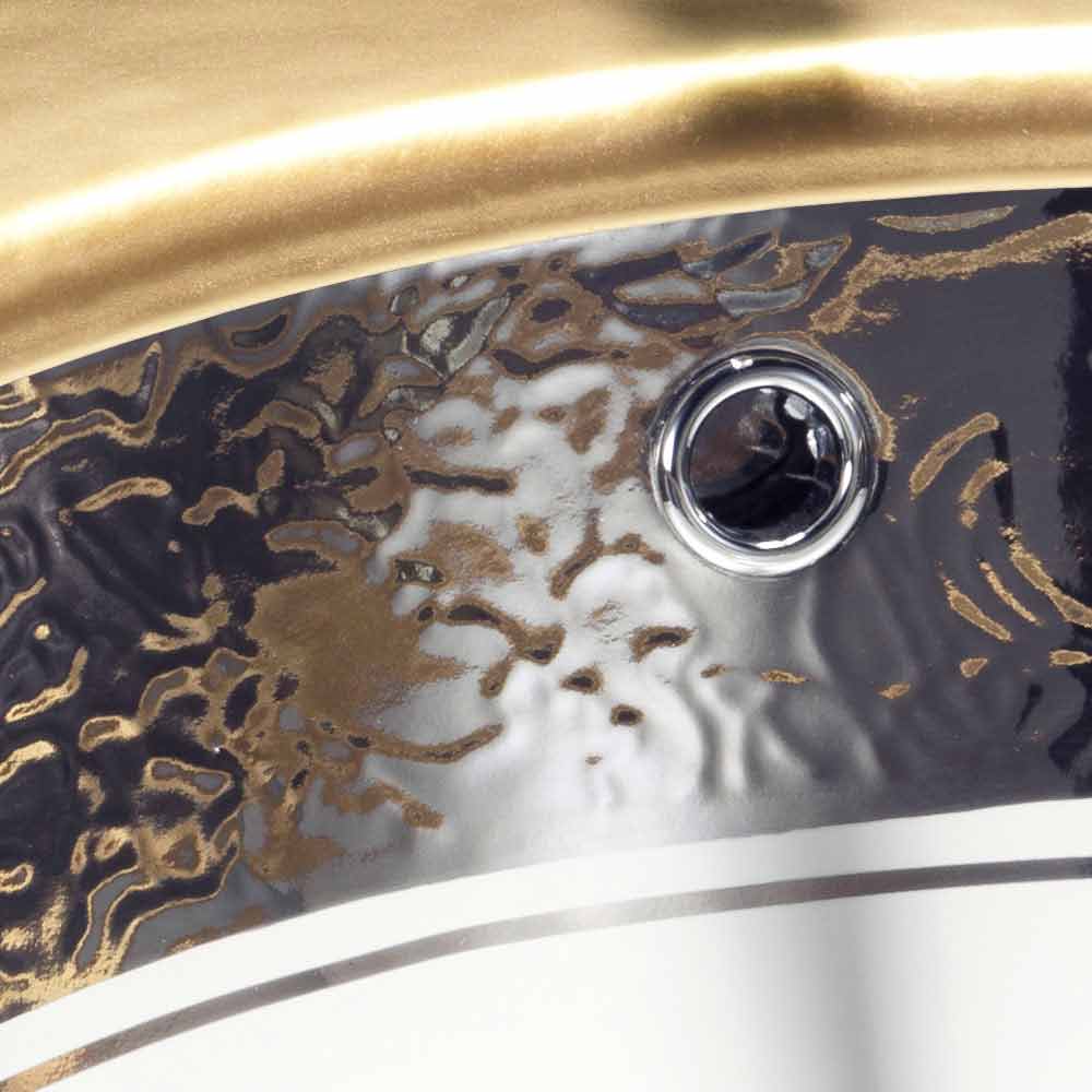 Banheiro construído em pia feita na Itália em argila de fogo, feito à mão, com faixa de efeito de baixo-relevo e trança eith acabamento de platina.