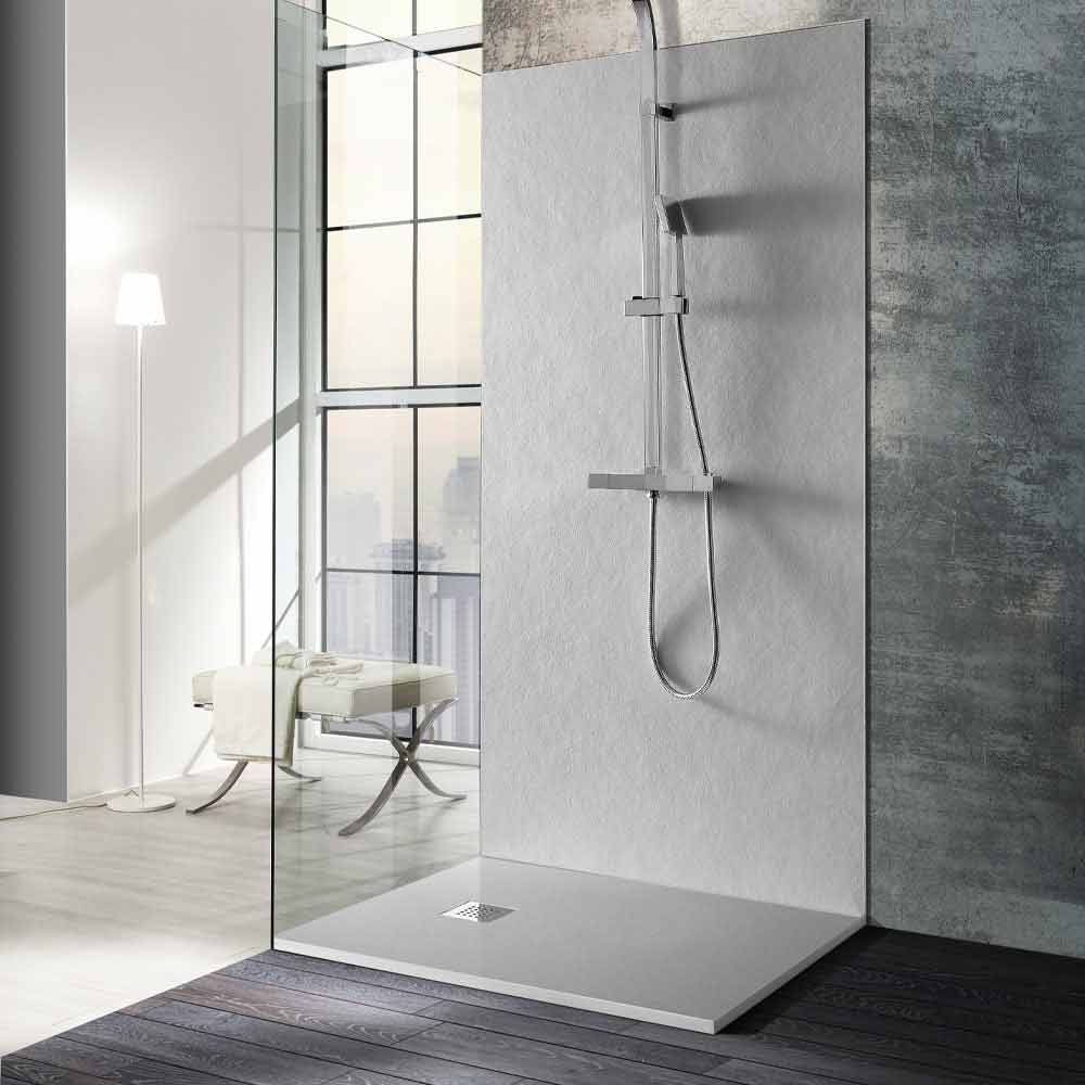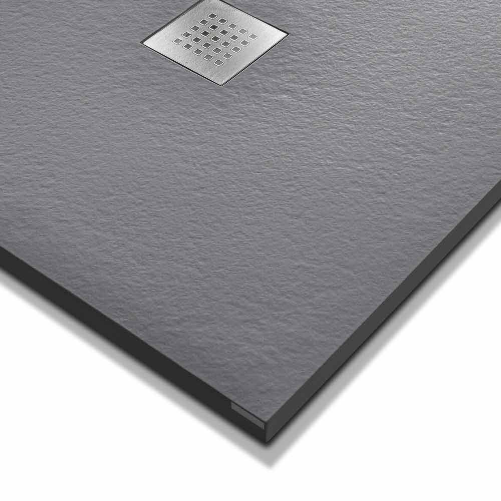 Base de duche moderna em resina com acabamento em efeito pedra e grelha de aço.