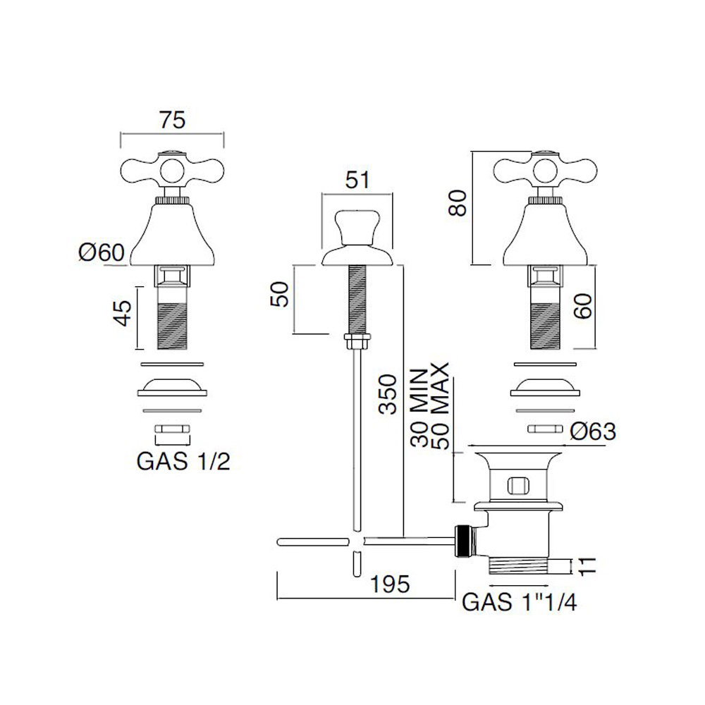 Torneira de bidé clássica de 3 furos com dreno e fornecimento interno de alta qualidade fabricada em Itália.