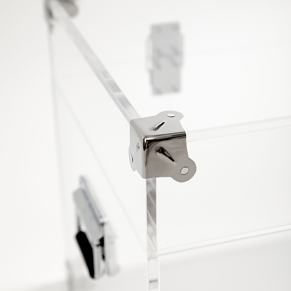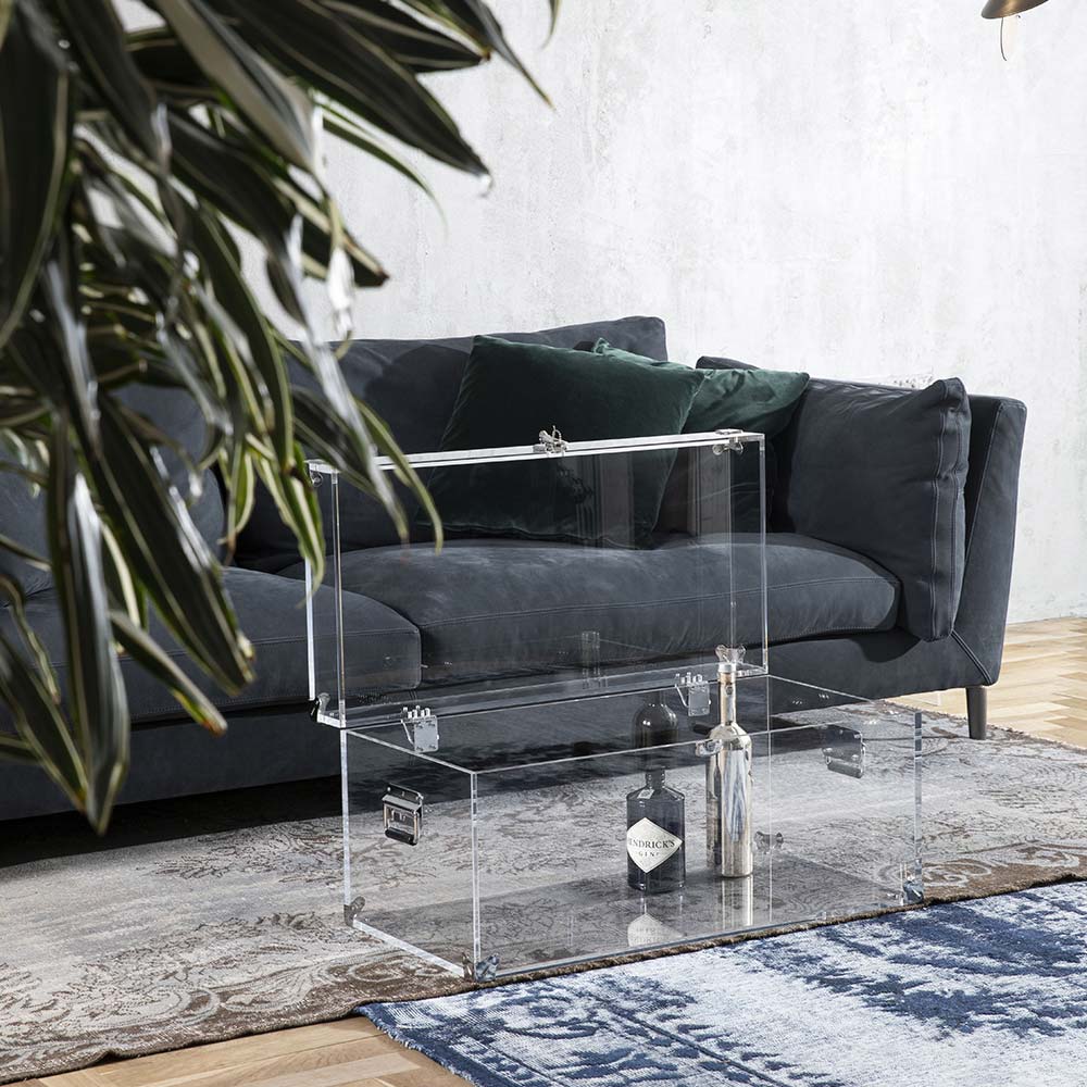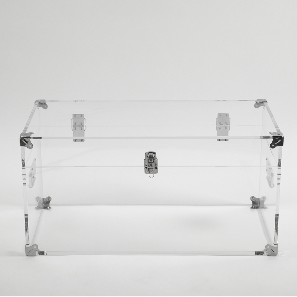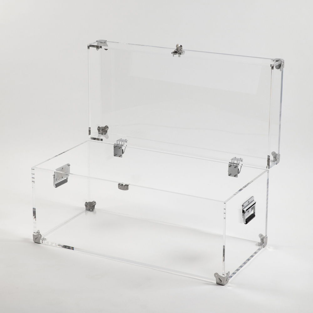 Este baú é inteiramente feito de cristal acrílico dobrado disponível em 2 variantes, inteiramente colado em UV com acabamentos em aço cromado precioso.