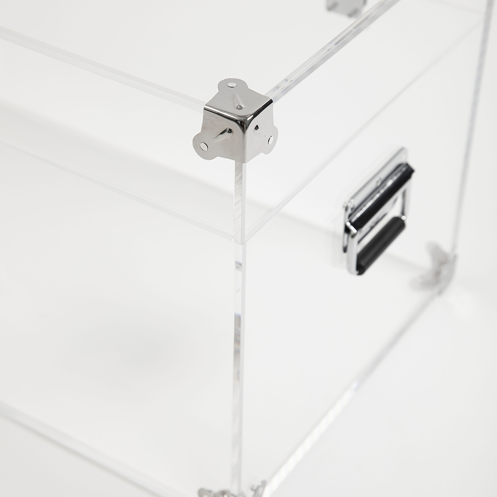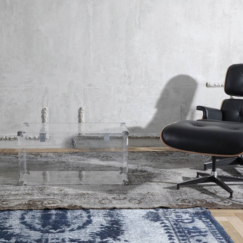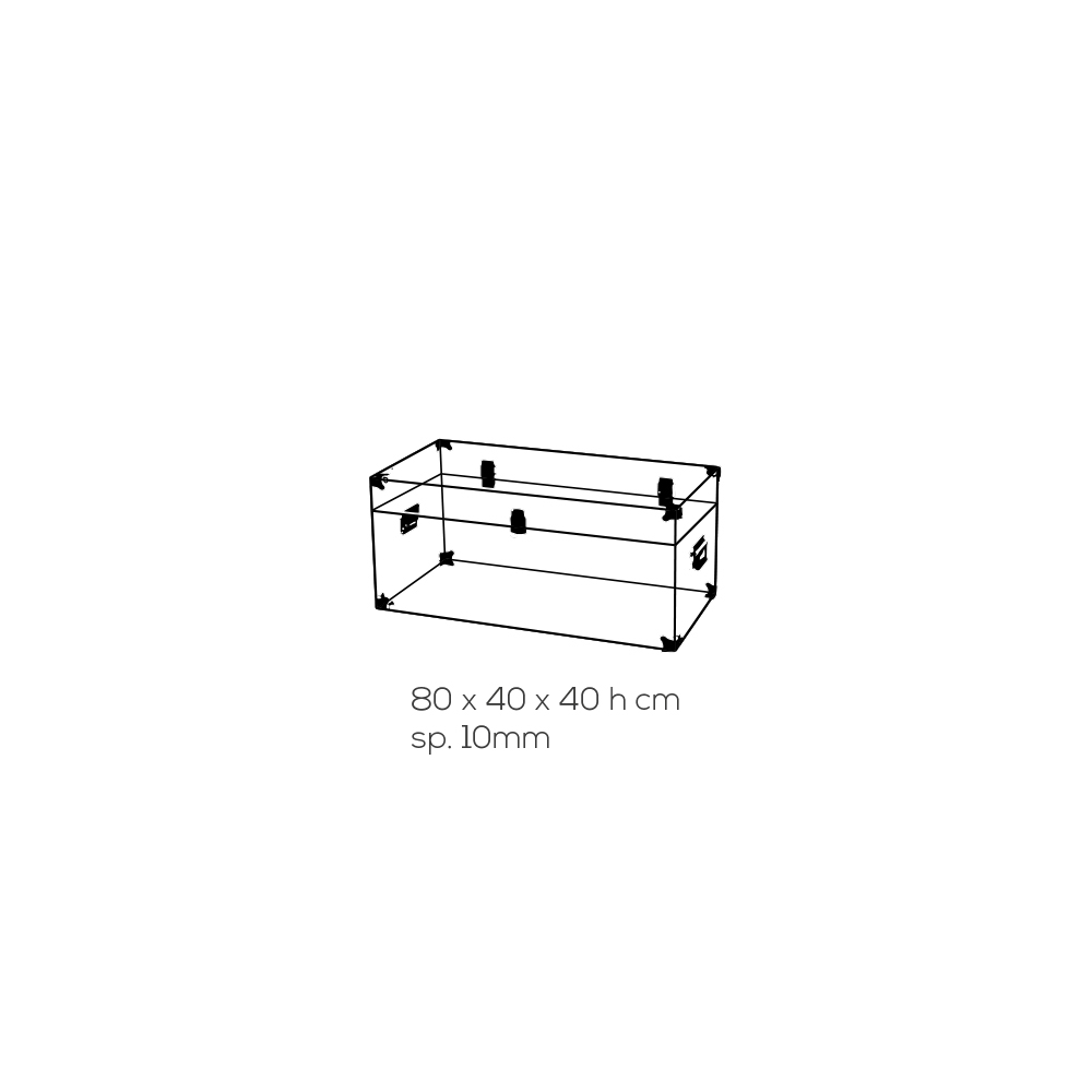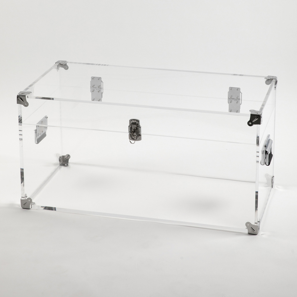 Este baú é inteiramente feito de cristal acrílico dobrado disponível em 2 variantes, inteiramente colado em UV com acabamentos em aço cromado precioso.