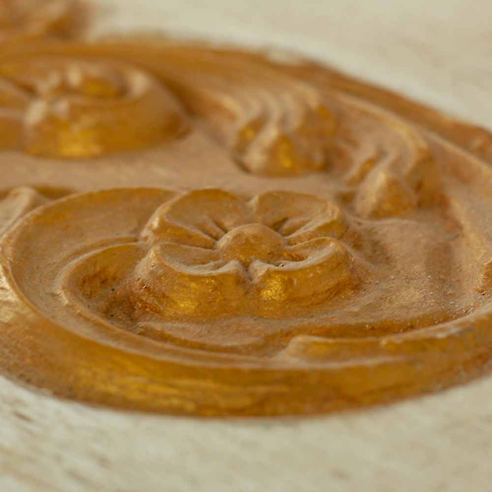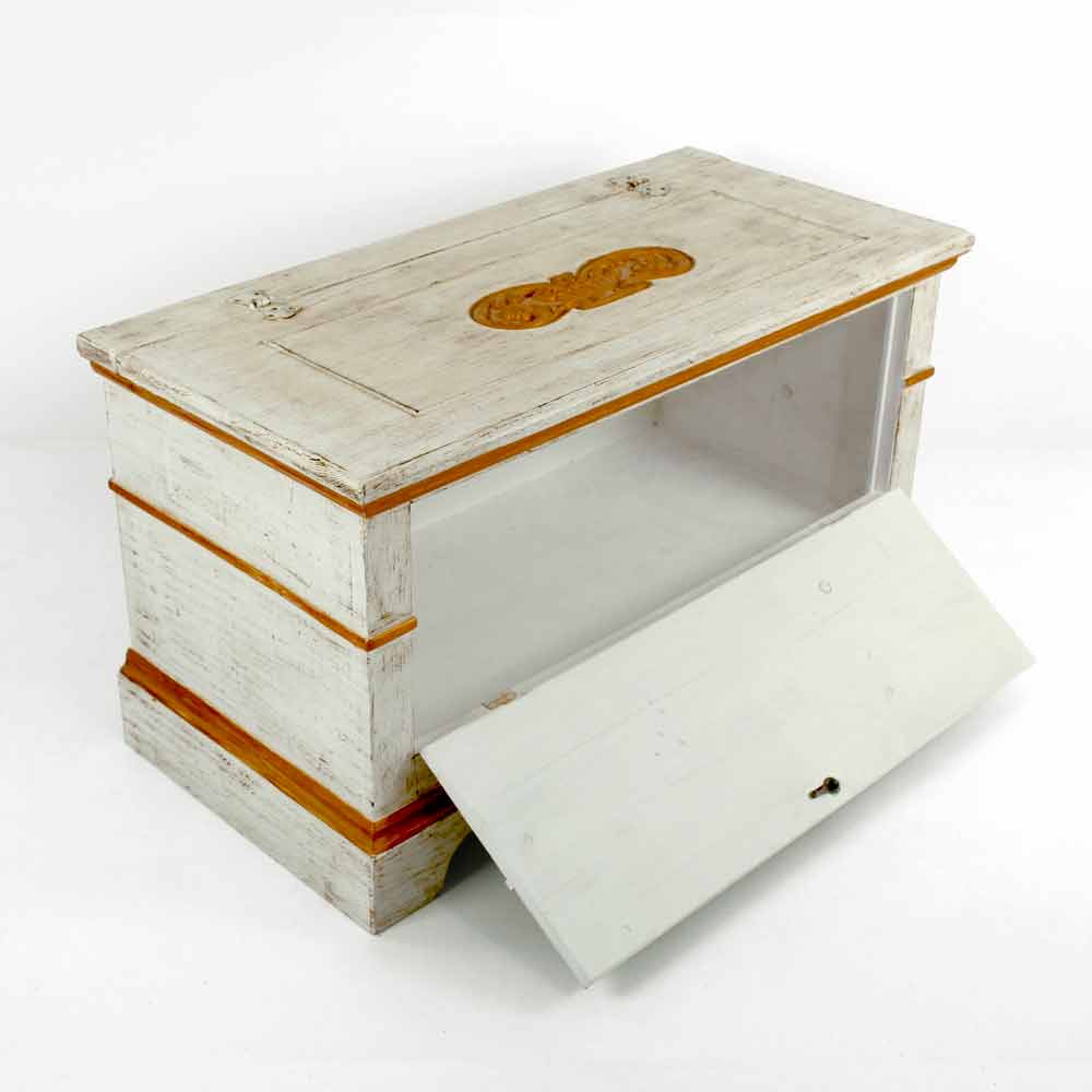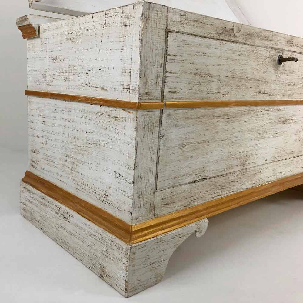 Baú feito à mão na Itália com estrutura em madeira maciça de abeto com acabamento branco envelhecido, equipado com dupla abertura (superior e frontal) e detalhes pintados à mão na cor ouro antigo. O produto tem acabamento transparente que o torna hidrorrepelente e fixa as cores para torná-las imutáveis ao longo do tempo.