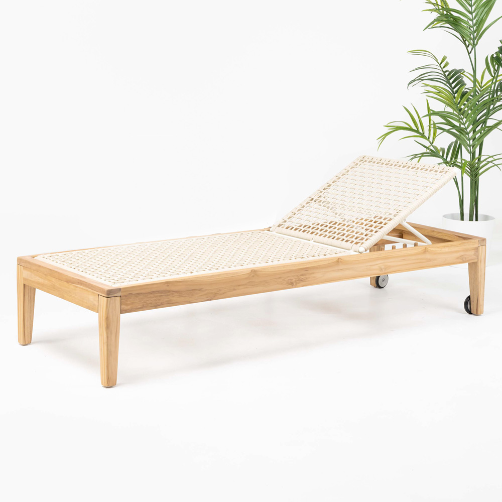 Espreguiçadeira de exterior em madeira de teca e corda tecida.