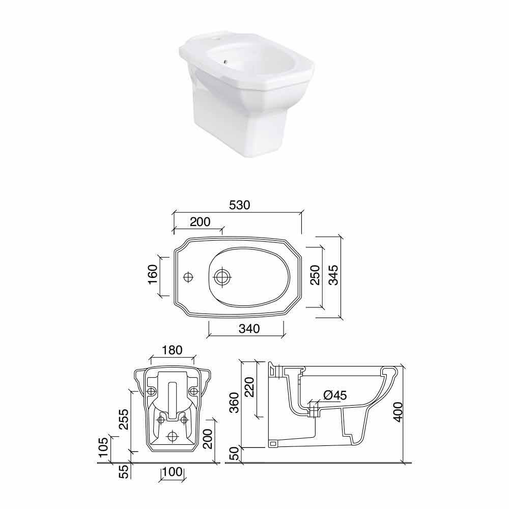 Bidé suspenso fabricado na Itália em cerâmica branca, estilo clássico, Nausica.