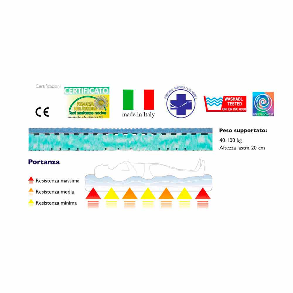 A melhor respirabilidade também é garantida pelo perfil particular e dos furos que se ligam à camada de espuma de memória "Nature" que suporta em um peso corporal correto e eficaz, este também moldado na parte inferior para facilitar o uso deste produto em redes mecanizada.