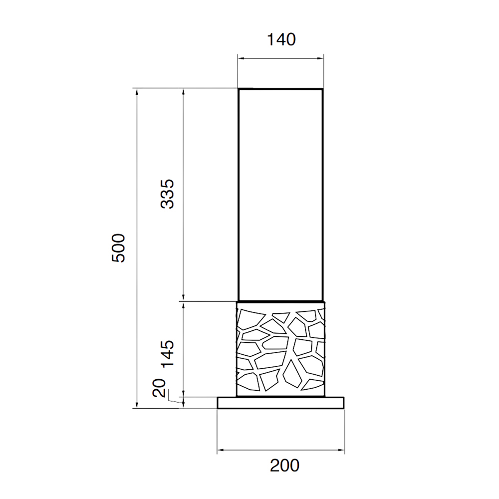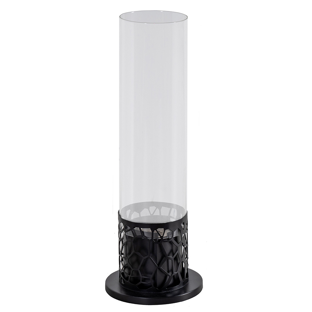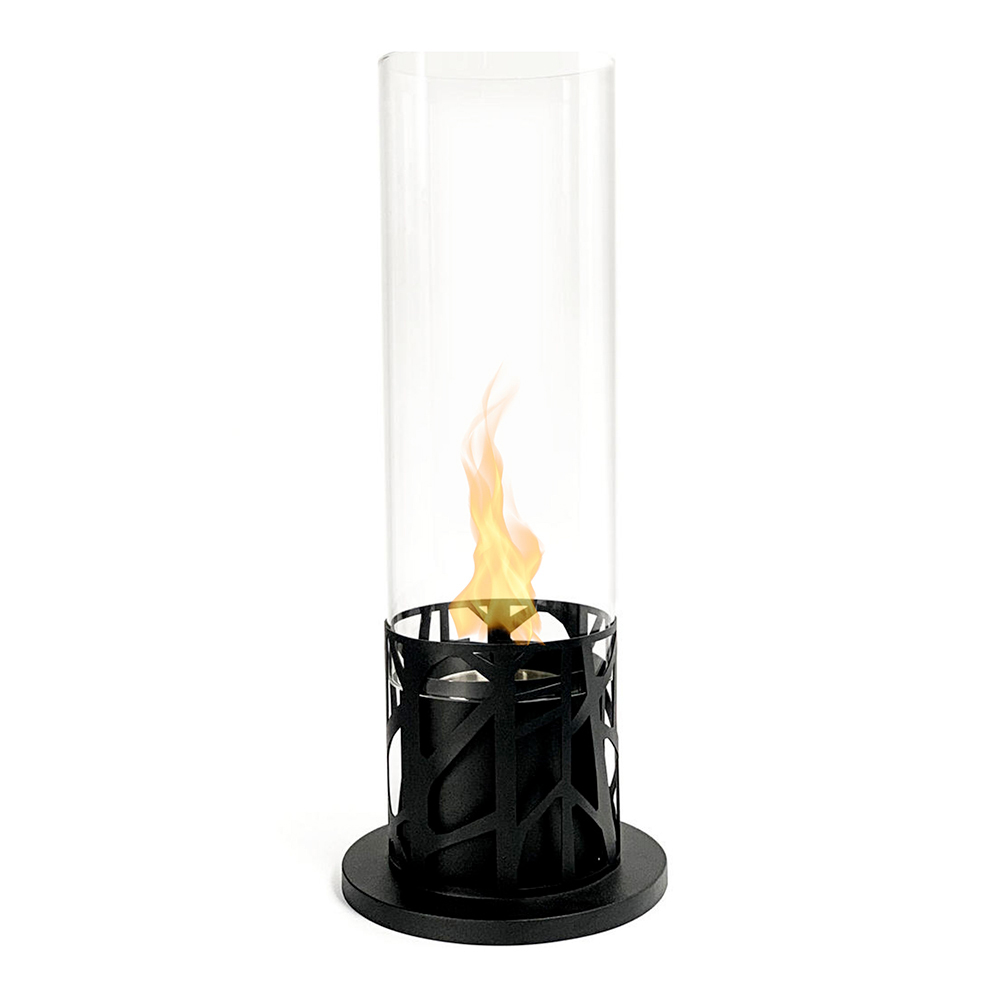 A estrutura é metálica e o vidro temperado protege a chama de possíveis rajadas de vento, destacando-a; isso também o torna adequado para ambientes externos.