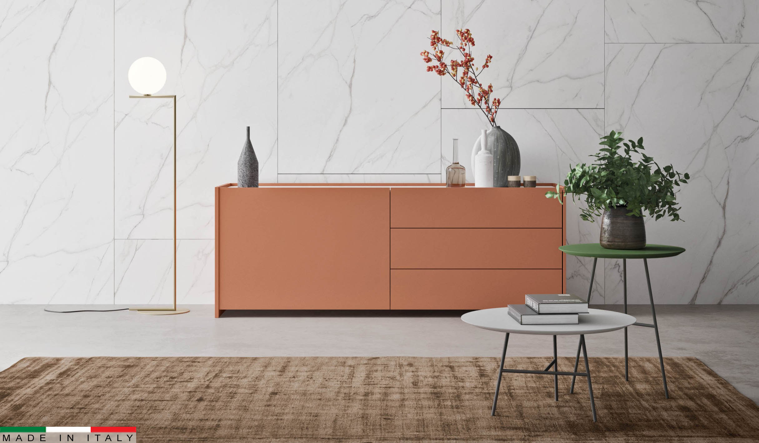 É uma peça de mobiliário criada com base nos valores do artesanato, para alcançar a excelência e a alta qualidade típicas do Made in Italy, onde se entrelaçam ideias inovadoras e cultura em favor da otimização de processos e atenção aos detalhes. Nasce assim um mobiliário funcional e requintado para a sala de estar.