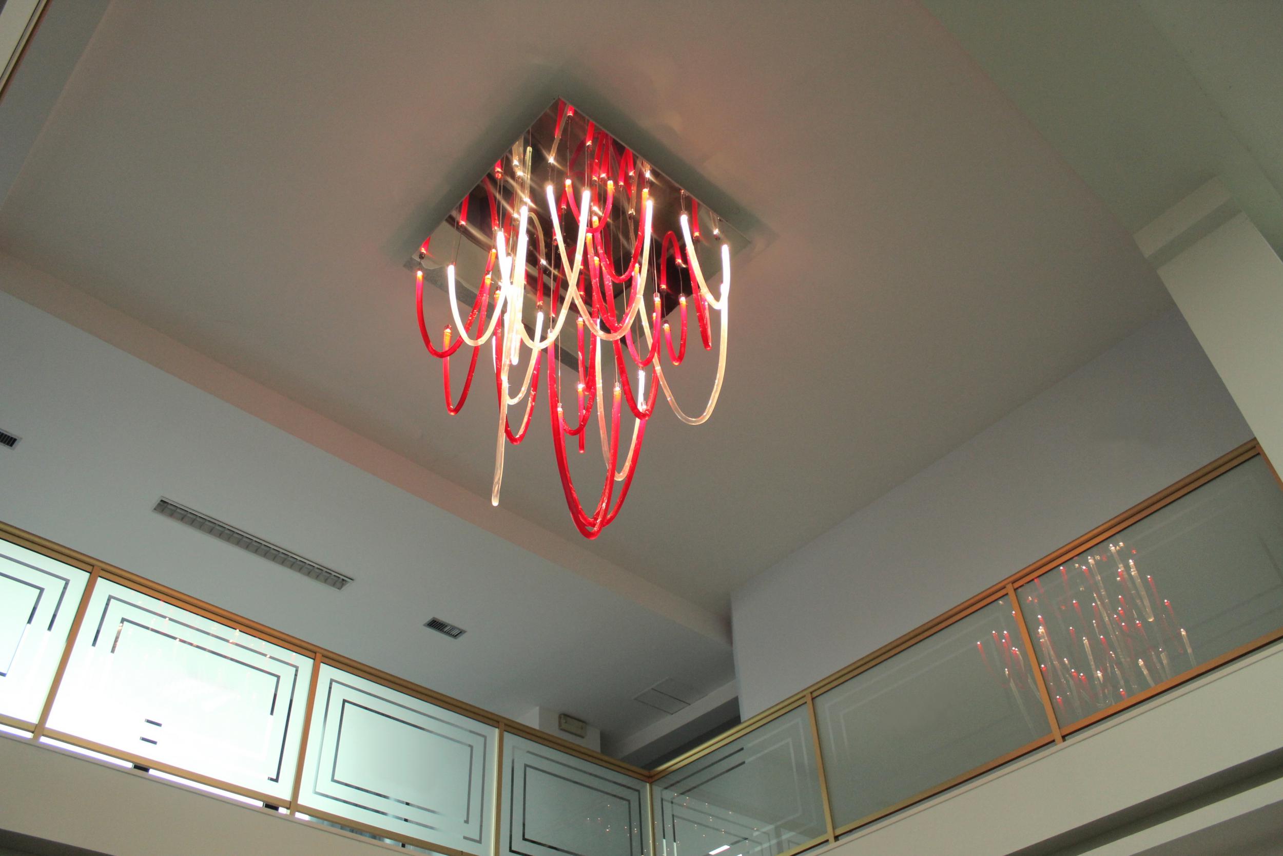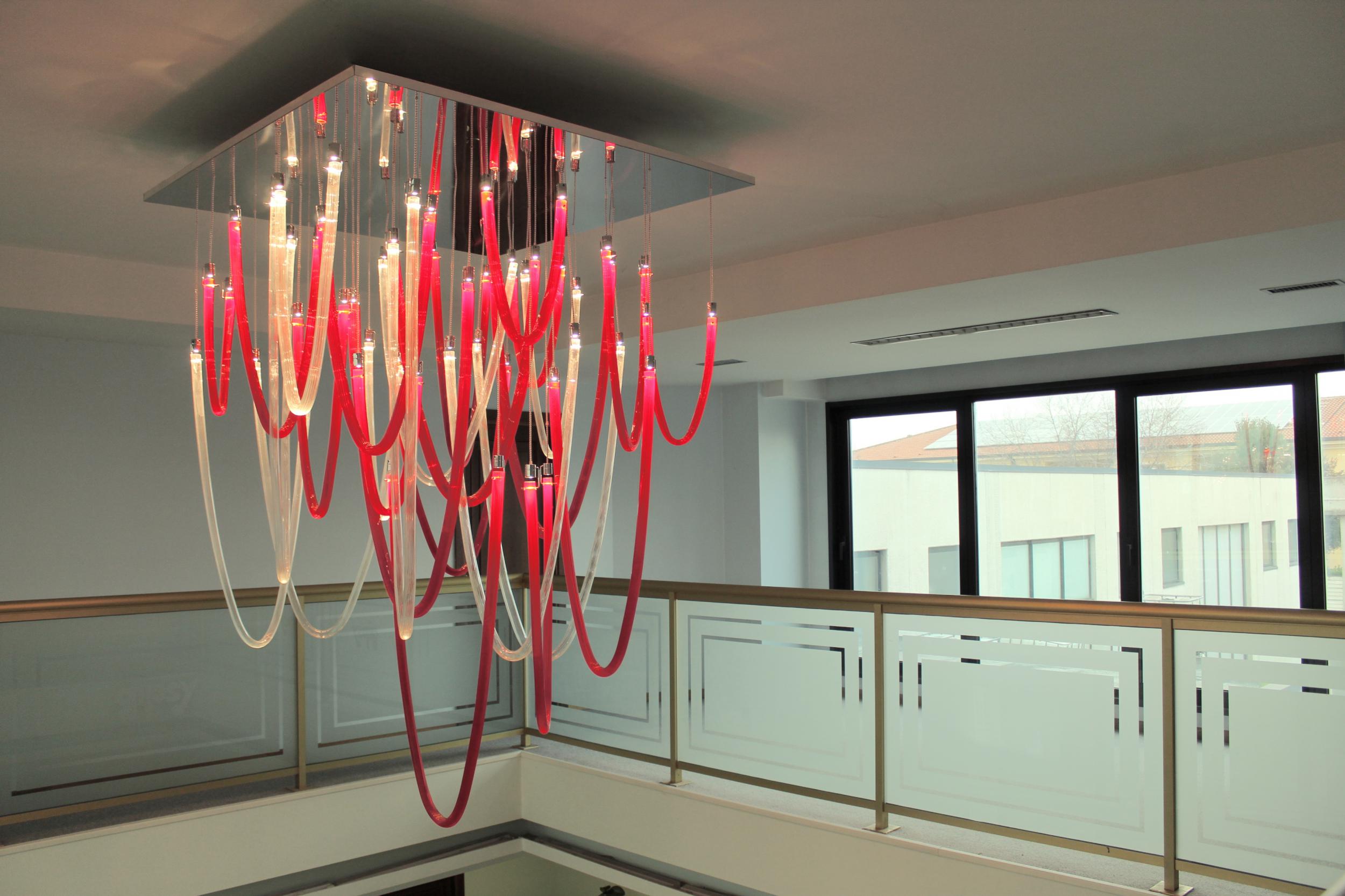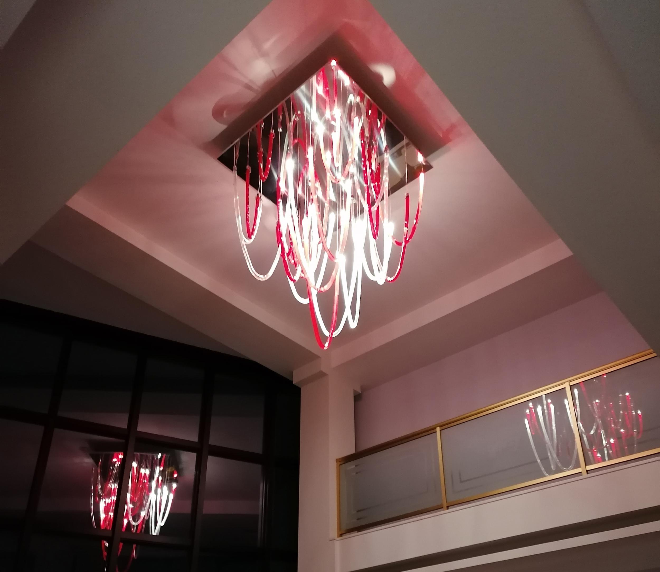 Majestoso e elegante, possui uma base quadrada com um lado de 140cm, da qual os elementos de vidro soprado com nervuras finas iluminadas por LEDs descem suavemente. A altura total do candelabro é de 220 cm. Elegante e acolhedora é a luz que esses LEDs espalham pelo vidro vermelho e transparente que compõe todo o lustre que escolhemos. Mas lembre-se de que esta lâmpada também se presta a personalizações em cores e tamanhos.