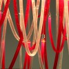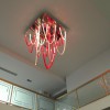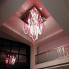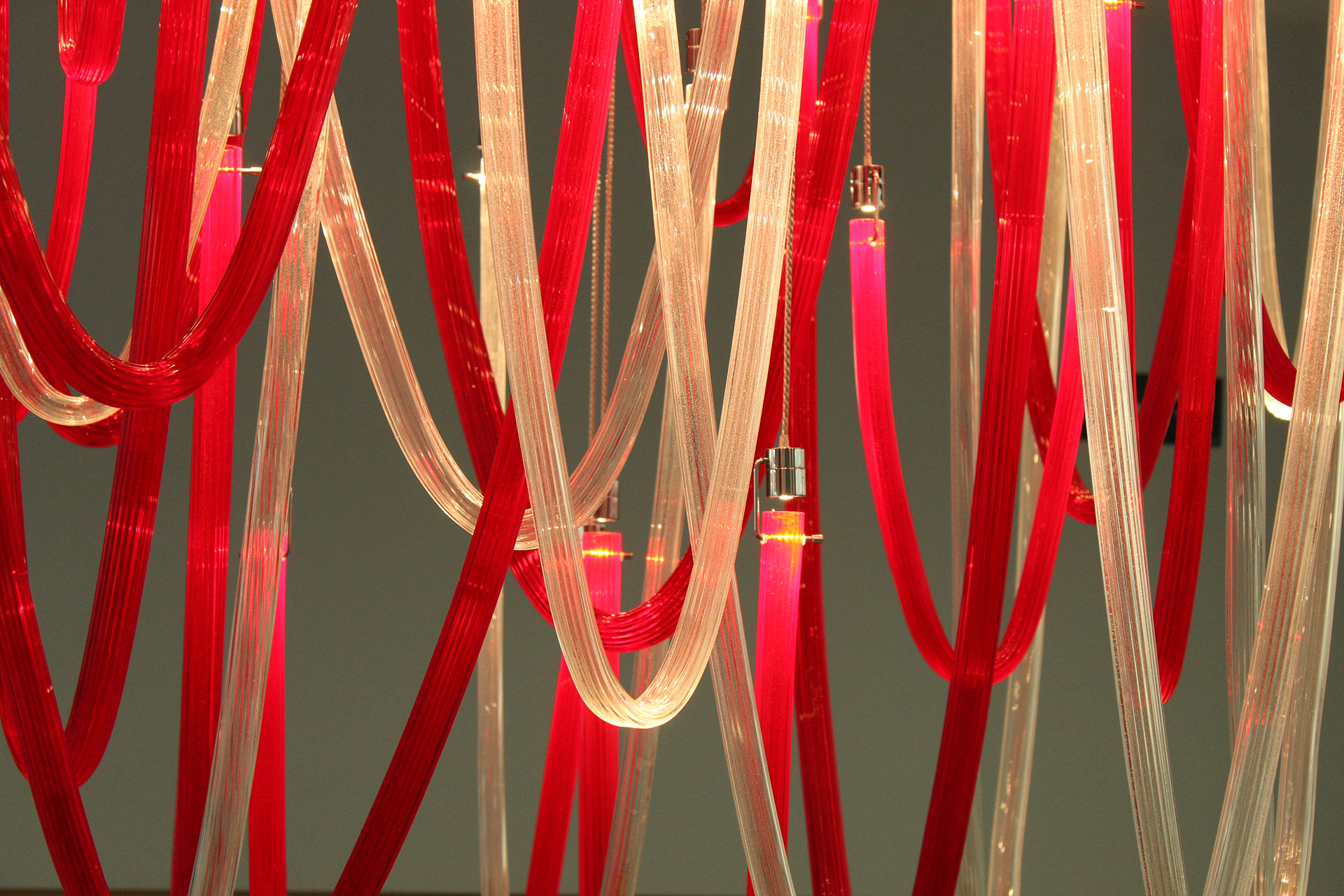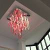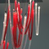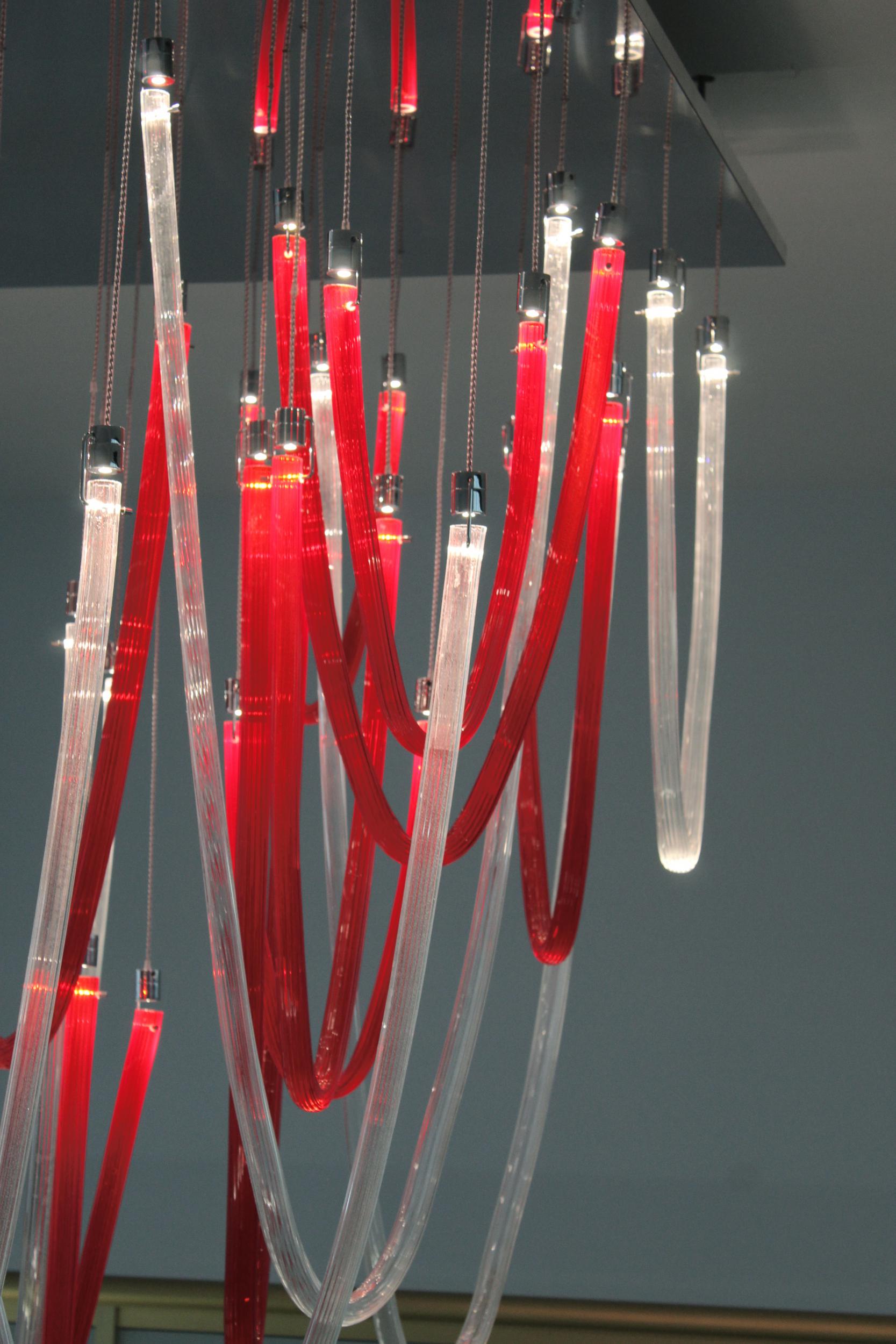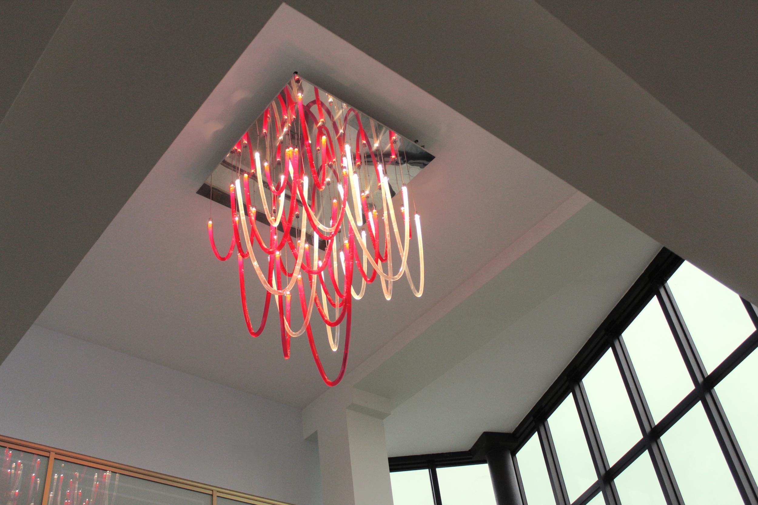 Majestoso e elegante, possui uma base quadrada com um lado de 140cm, da qual os elementos de vidro soprado com nervuras finas iluminadas por LEDs descem suavemente. A altura total do candelabro é de 220 cm. Elegante e acolhedora é a luz que esses LEDs espalham pelo vidro vermelho e transparente que compõe todo o lustre que escolhemos. Mas lembre-se de que esta lâmpada também se presta a personalizações em cores e tamanhos.
