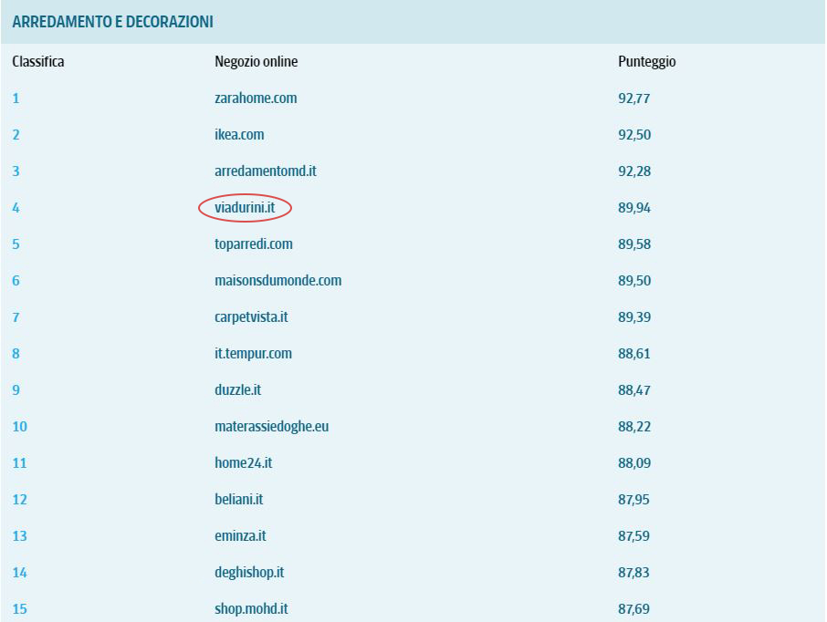 Graças aos resultados obtidos, a Viadurini se orgulha de comemorar o 4º lugar no ranking, atrás de gigantes como Ikea e Zarahome. O selo “As Estrelas do E-commerce 2020/2021” torna-se um novo prêmio que atesta o status de excelência da Viadurini não só no cenário nacional, mas também no internacional.