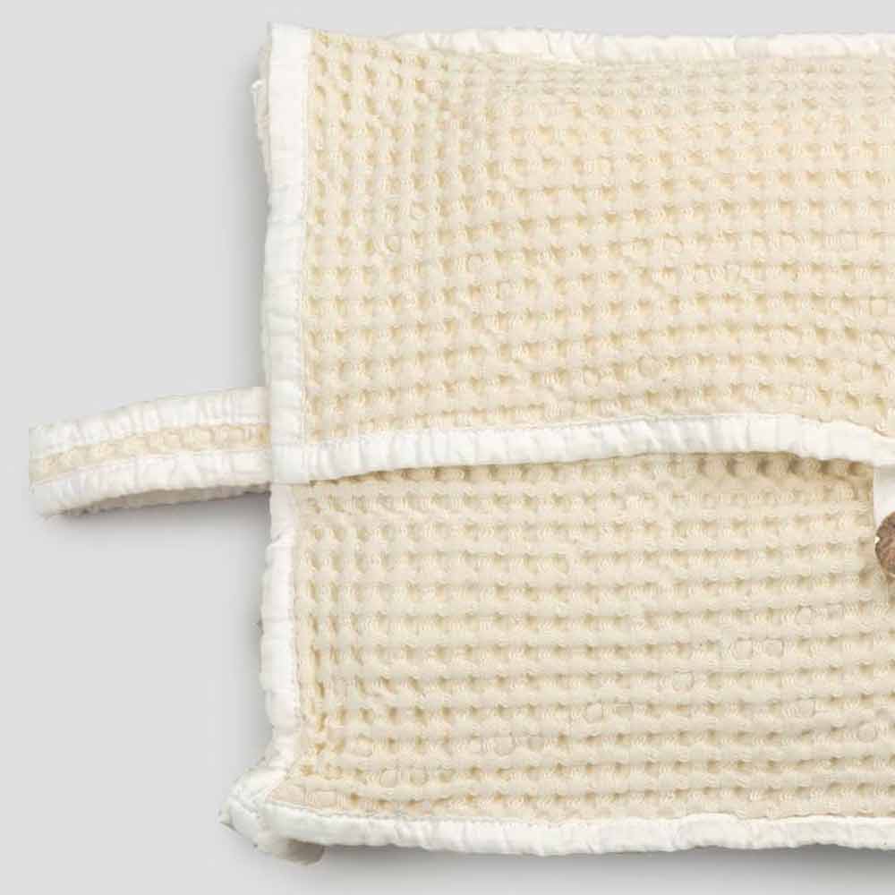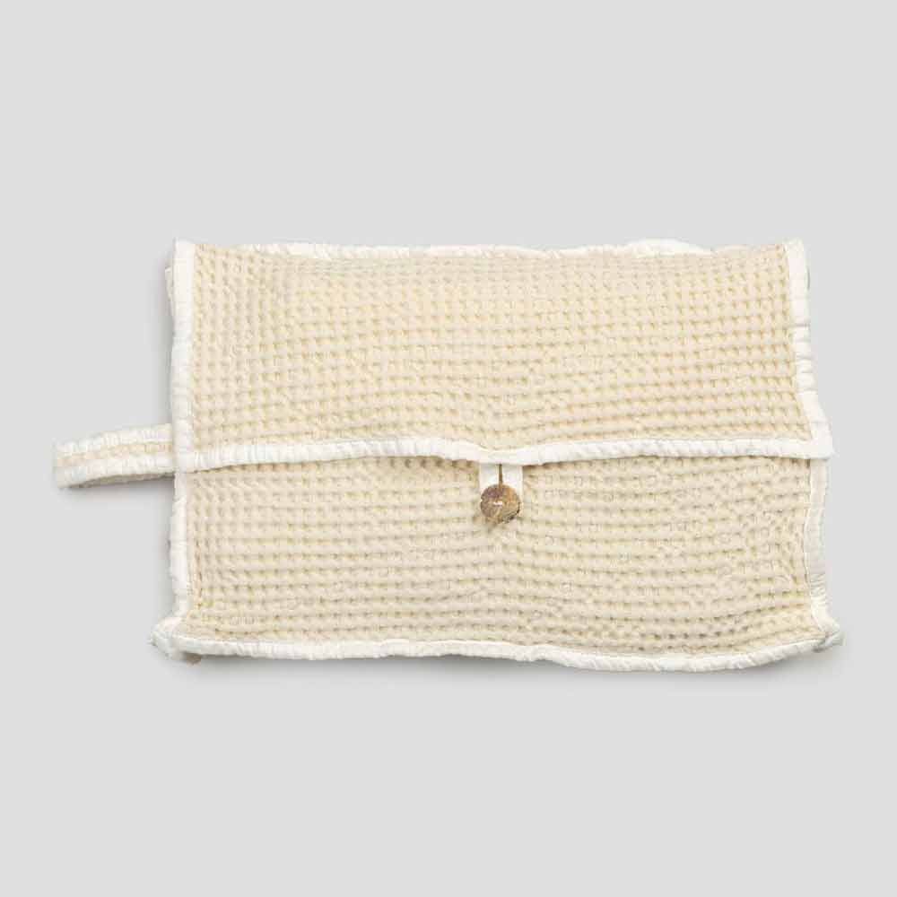 Pochette elegante em algodão favo de mel com fecho de botões em madrepérola, fabricada em Itália.