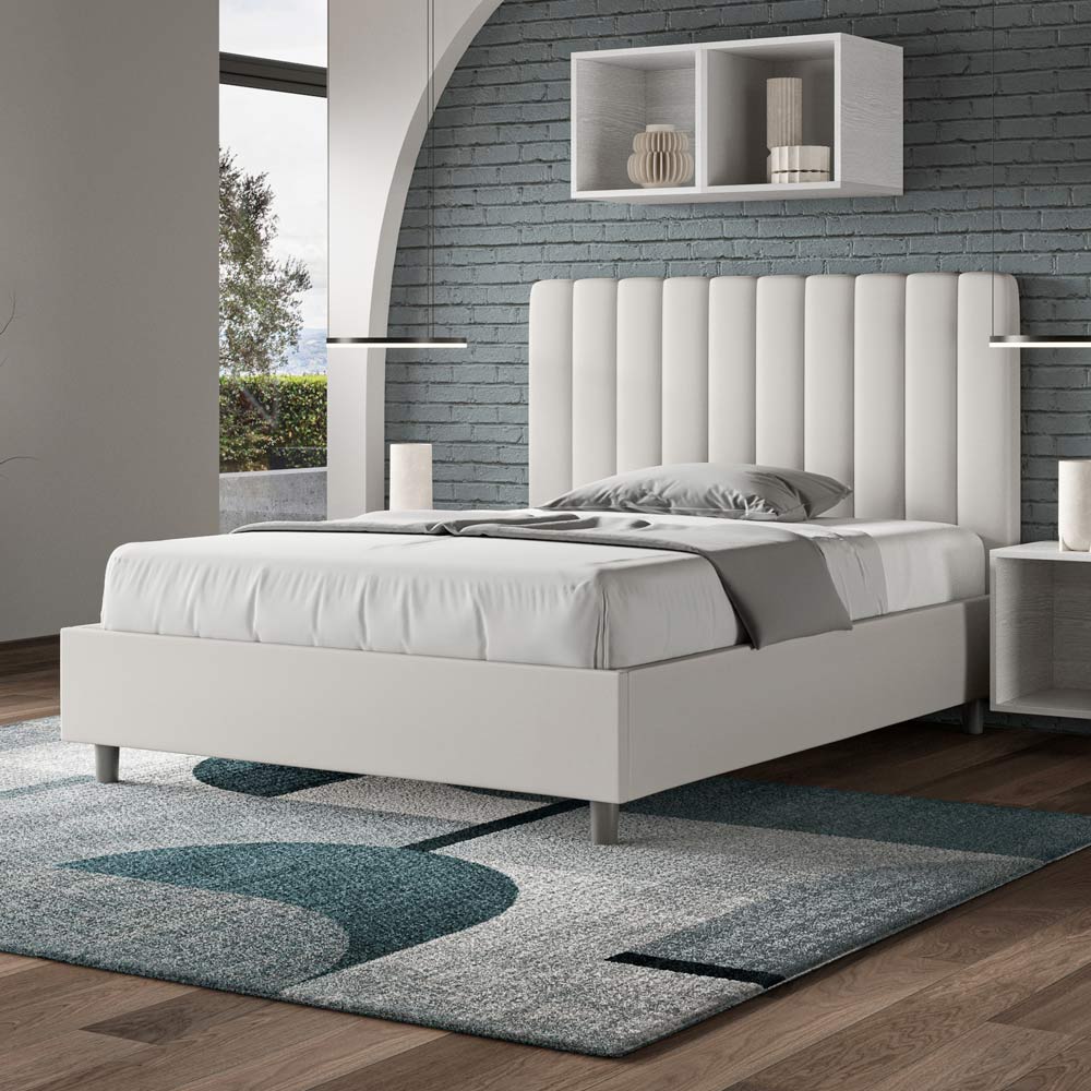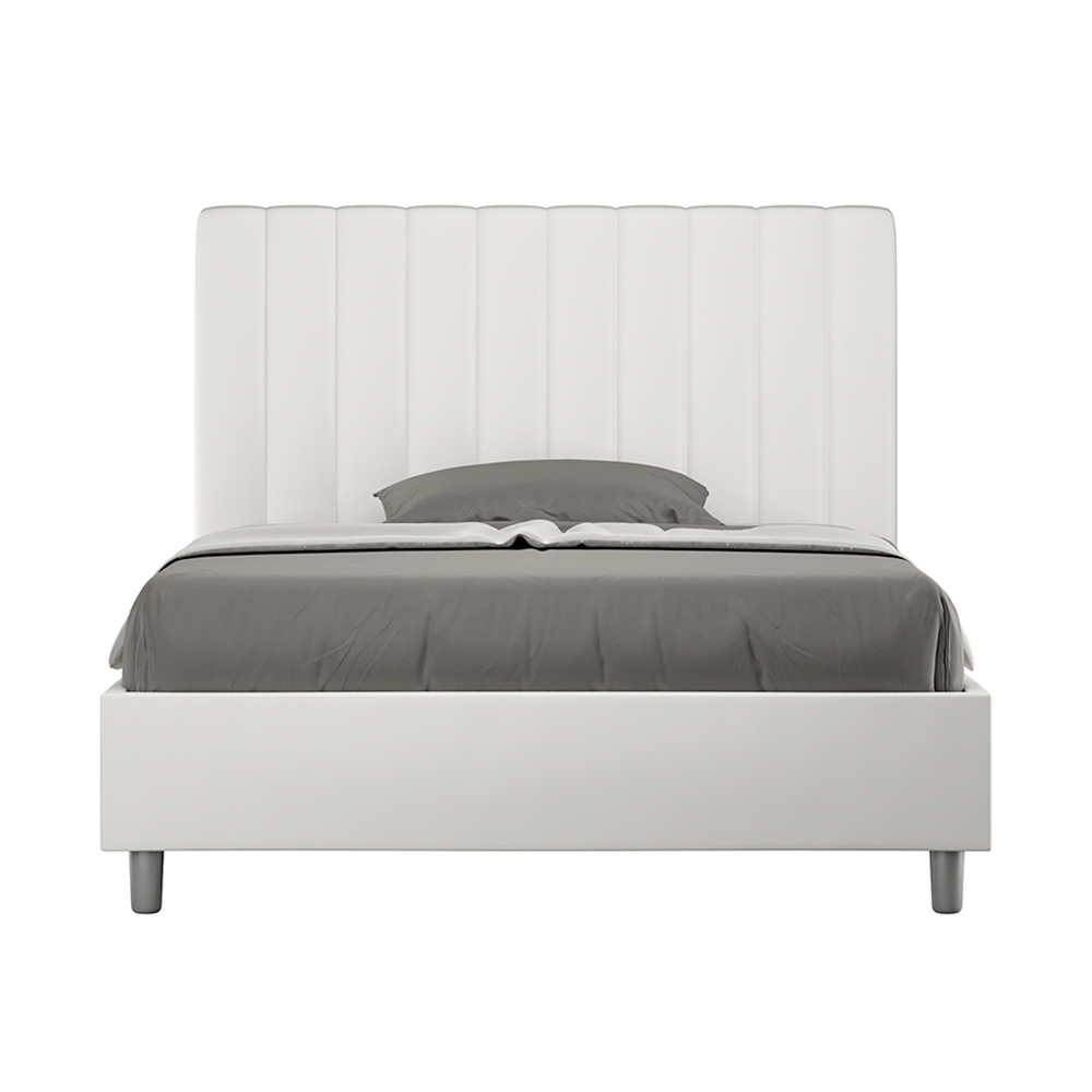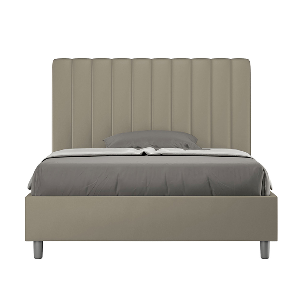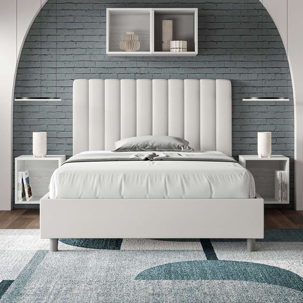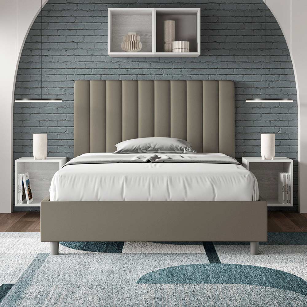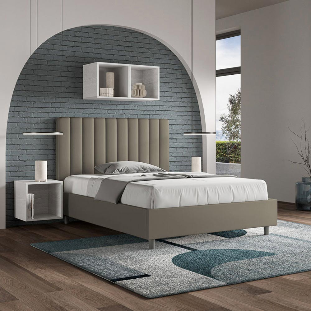 Cama de casal estofada de 120x200 cm, feita de painéis de aglomerado e revestida em imitação de couro , inteiramente fabricada na Itália. Esta cama de casal com estrutura estofada é ideal para quem busca uma peça marcante, porém discreta. A cabeceira minimalista, com um delicado efeito acolchoado de linhas verticais simétricas , harmoniza-se perfeitamente com qualquer estilo, seja moderno ou clássico. O estofamento em couro sintético confere um toque acolhedor e convidativo ao quarto. É especialmente indicado para ambientes bem iluminados, pois o material mantém sua cor mesmo após exposição prolongada à luz solar.