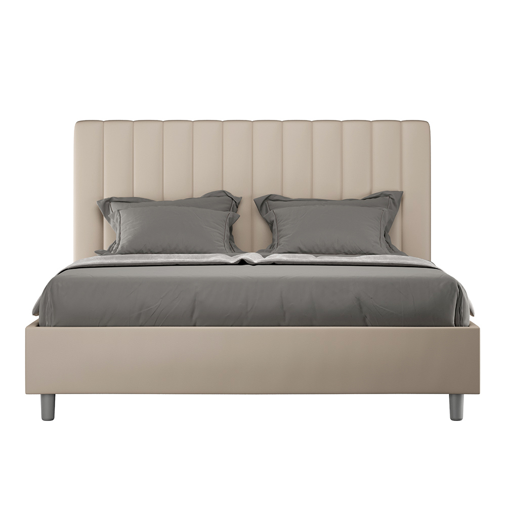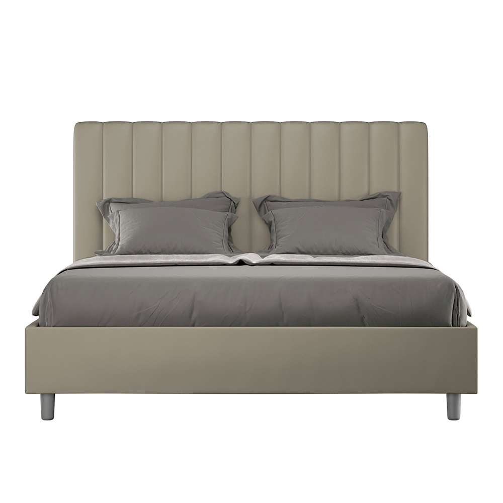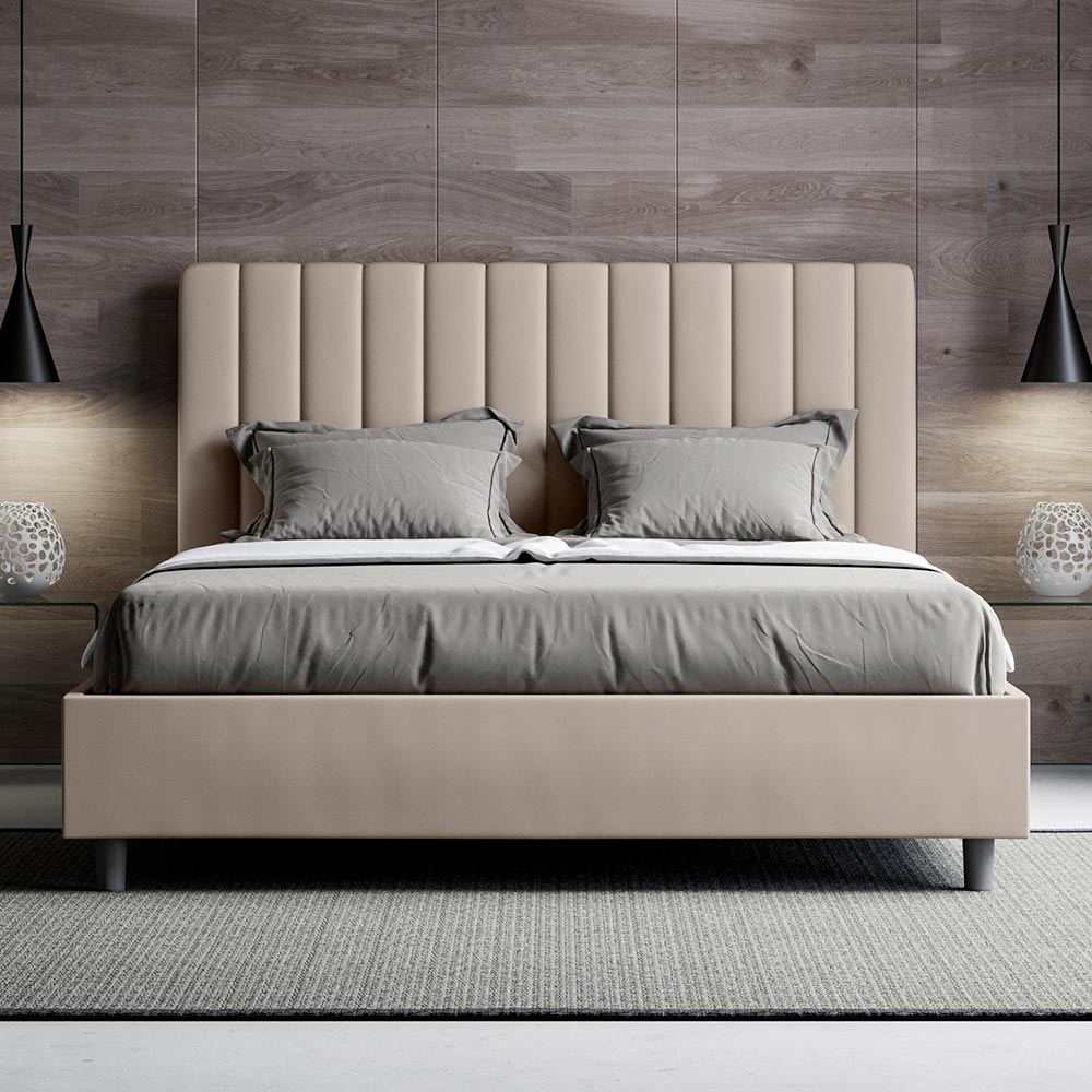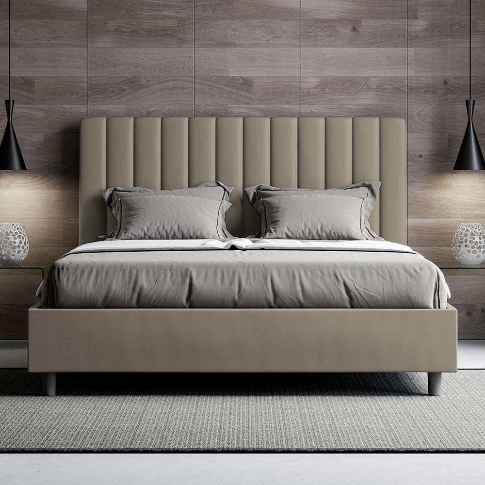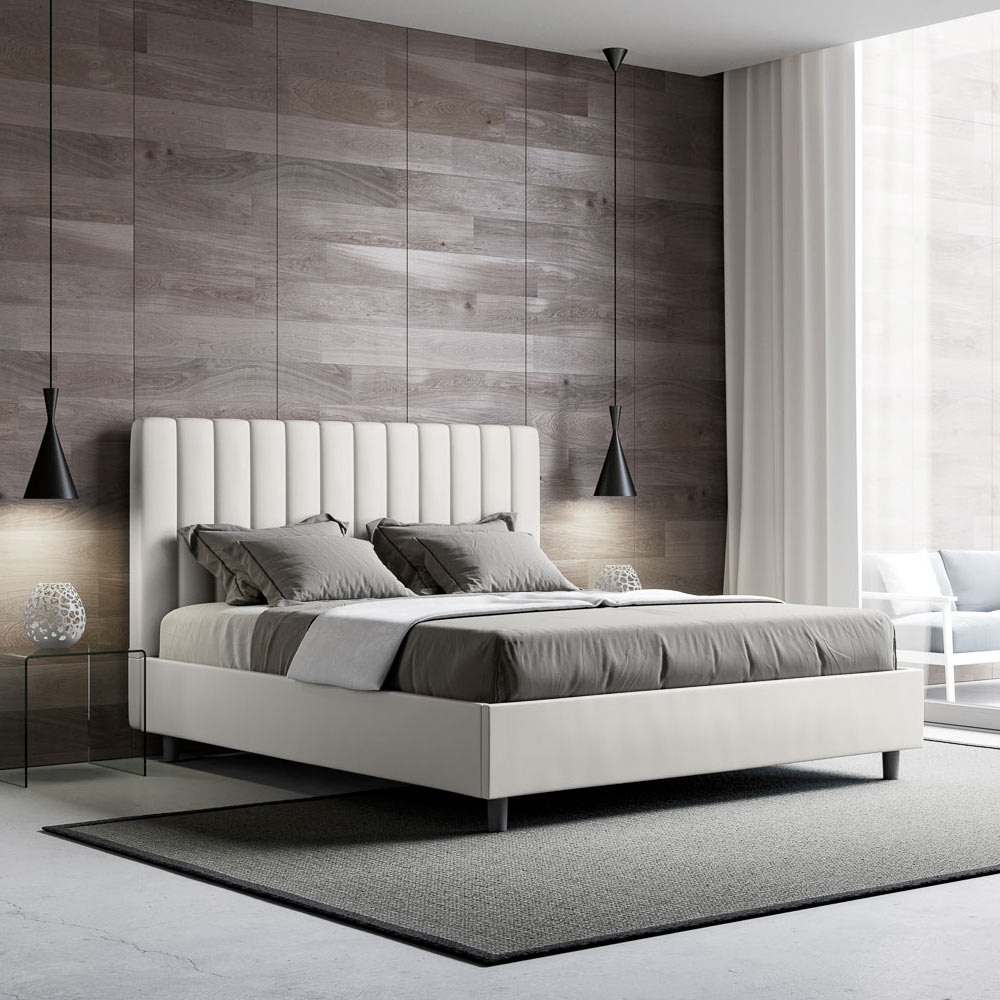 Cama de casal estofada de 160x200 cm, feita de painéis de aglomerado e revestida em imitação de couro , inteiramente fabricada na Itália. Esta cama de casal com estrutura estofada é ideal para quem busca uma peça marcante, porém discreta. A cabeceira minimalista, com um delicado efeito acolchoado de linhas verticais simétricas , harmoniza-se perfeitamente com qualquer ambiente, seja moderno ou clássico. O revestimento em couro sintético confere um toque acolhedor e convidativo ao quarto. É especialmente indicada para espaços bem iluminados, pois o material mantém a cor mesmo após exposição prolongada à luz solar.