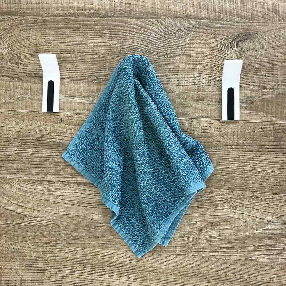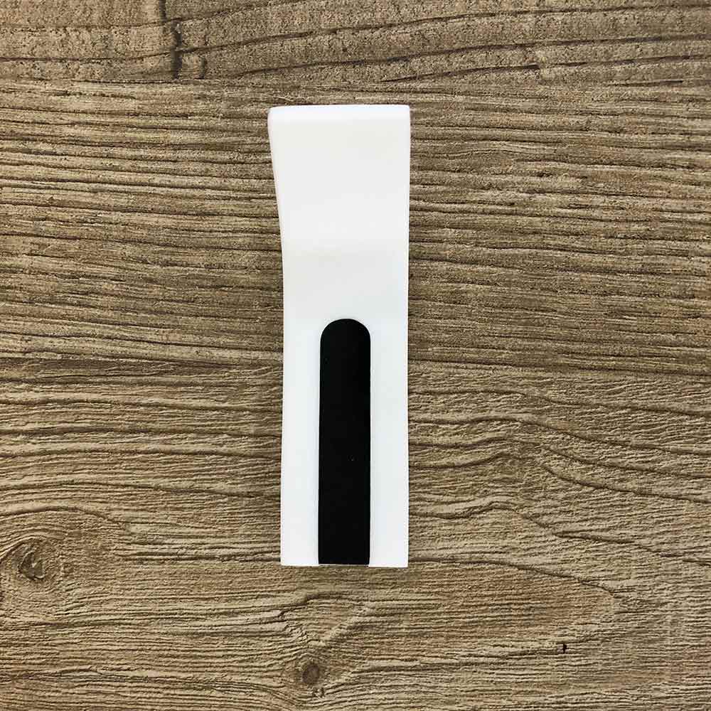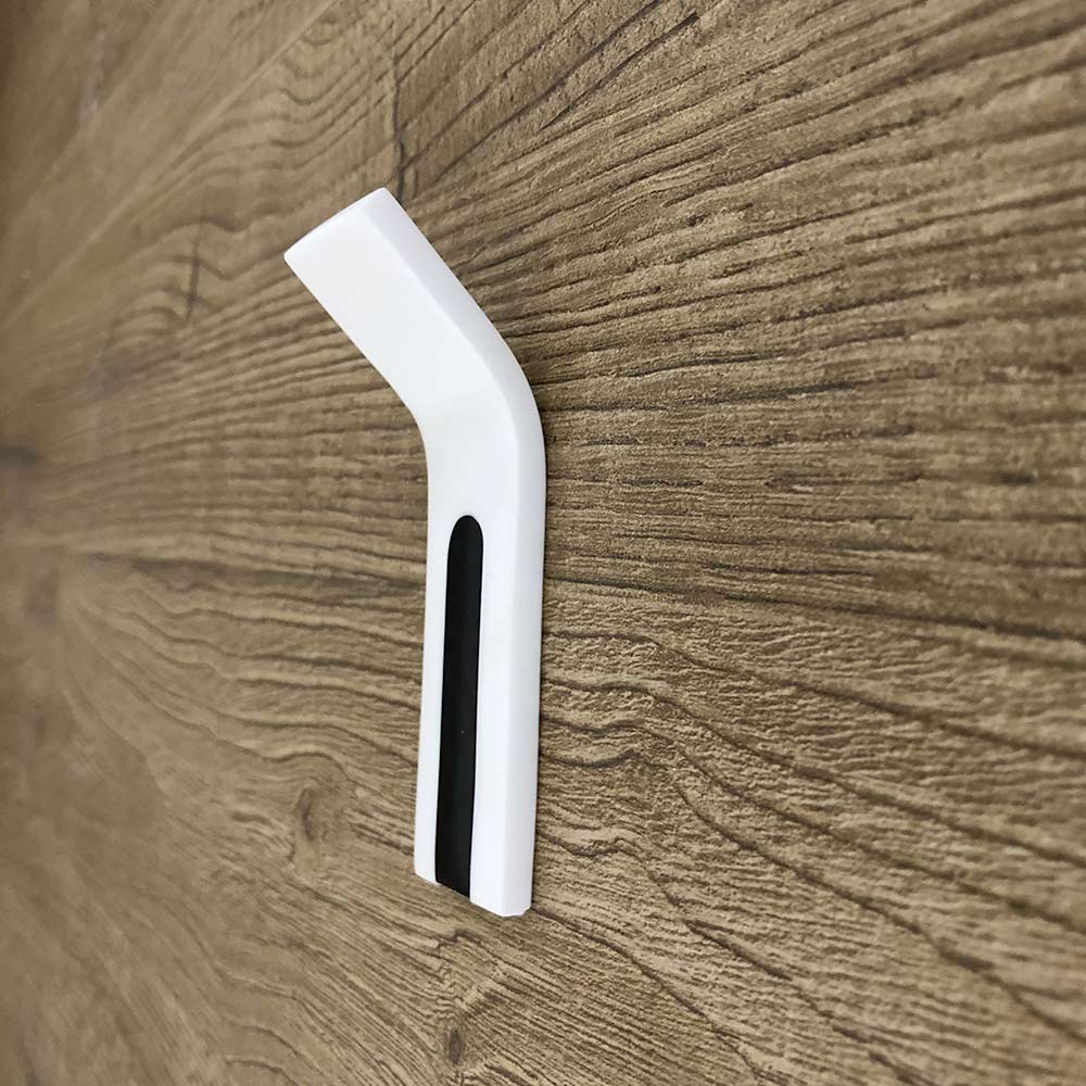 cabides de parede são feitos de uma superfície sólida de corian branca de 6 mm de espessura com uma faixa branca ou preta inserida.