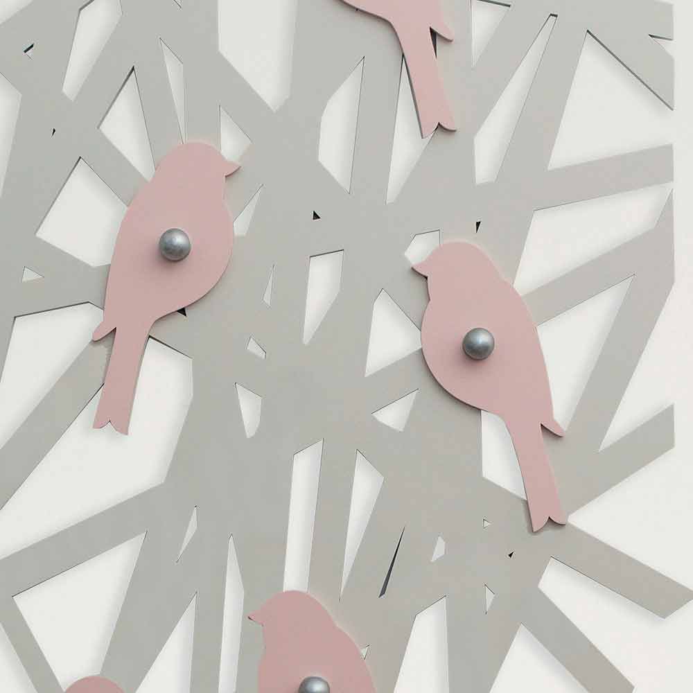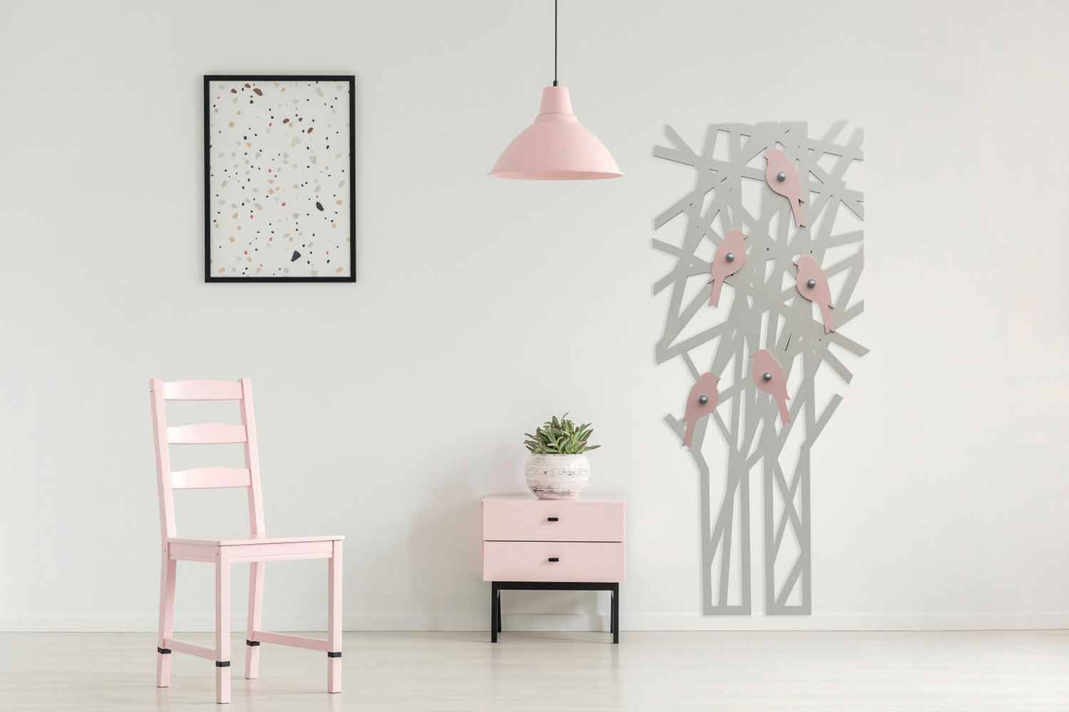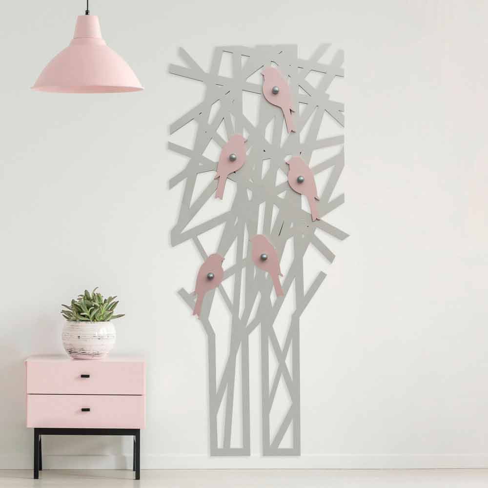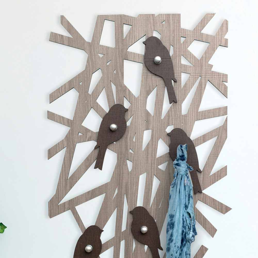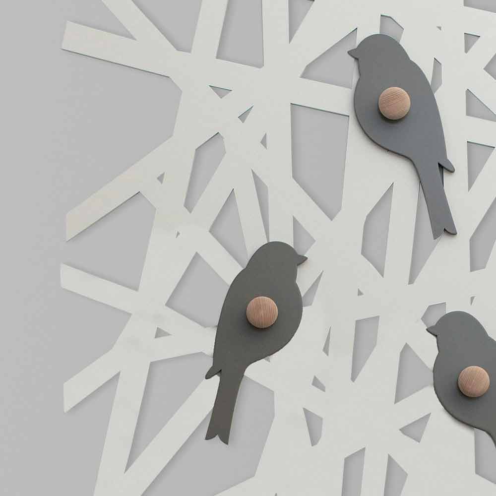 Cabide de parede para entrada, design moderno em forma de uma árvore estilizada com pássaros, fabricado na Itália.