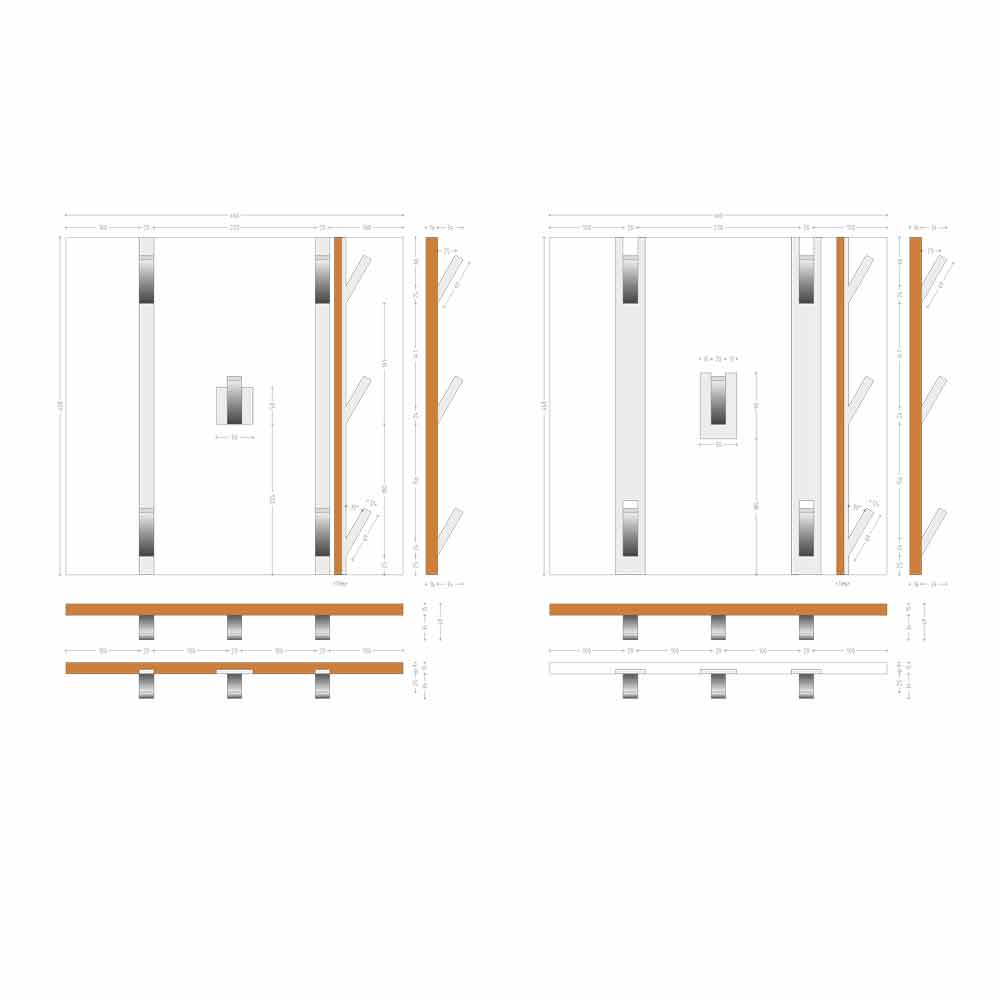 Painel de parede em madeira teca com inserções e cabides corian, de alta qualidade made in Italy.