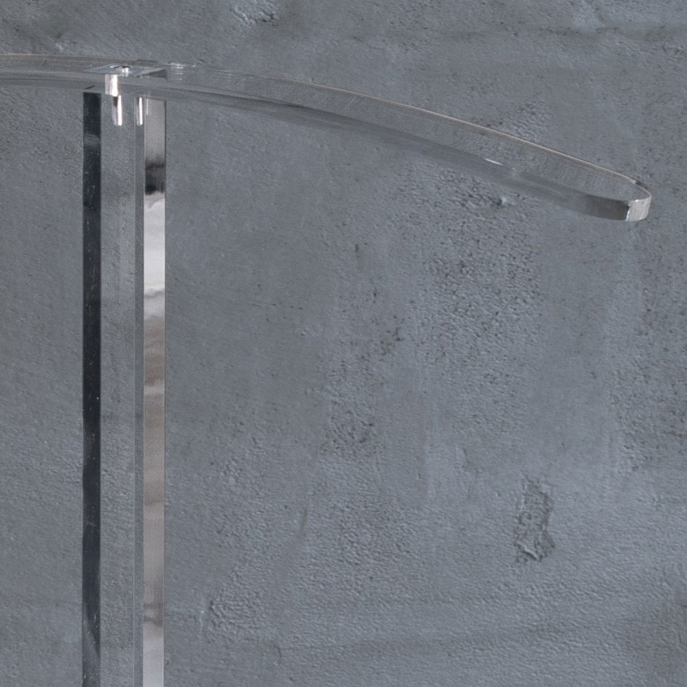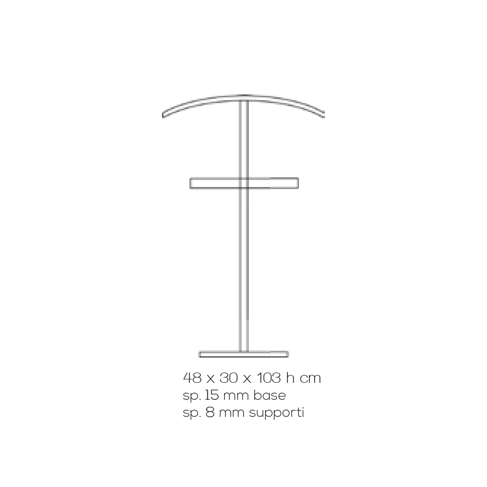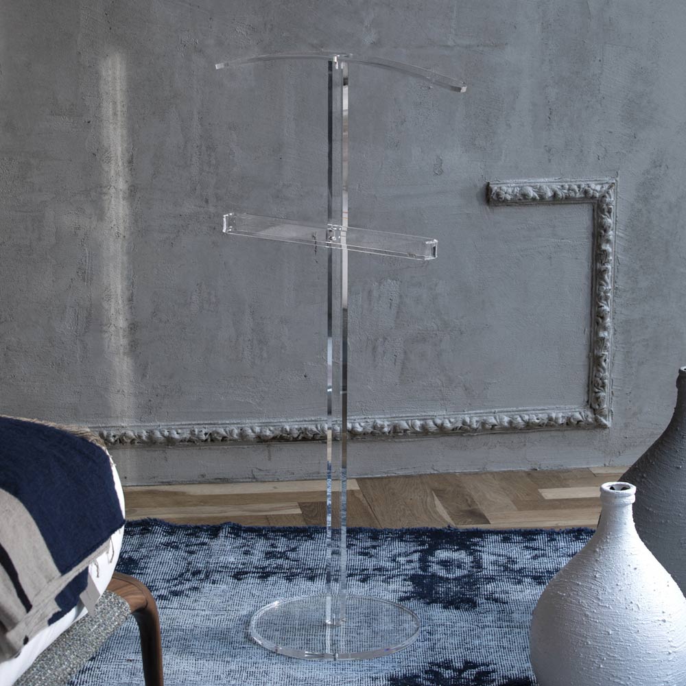 Feito inteiramente de cristal acrílico transparente com cabide de 8 mm de espessura e barra de calça quadrada de 25 mm de espessura, apresenta uma base redonda de 30 cm de diâmetro e 15 mm de espessura.