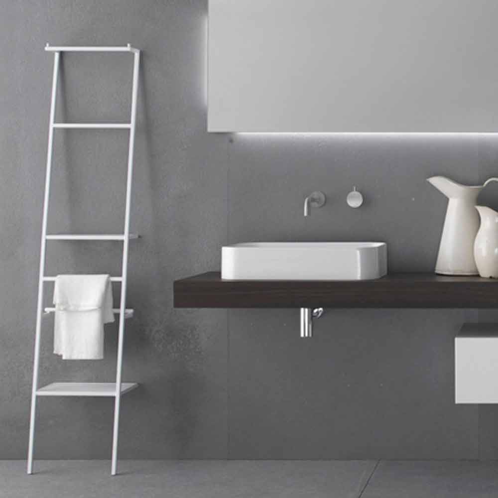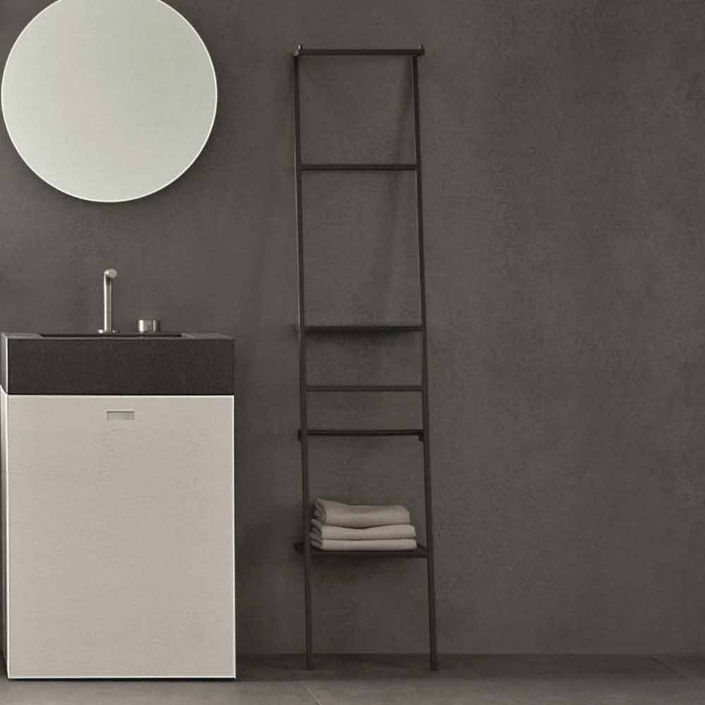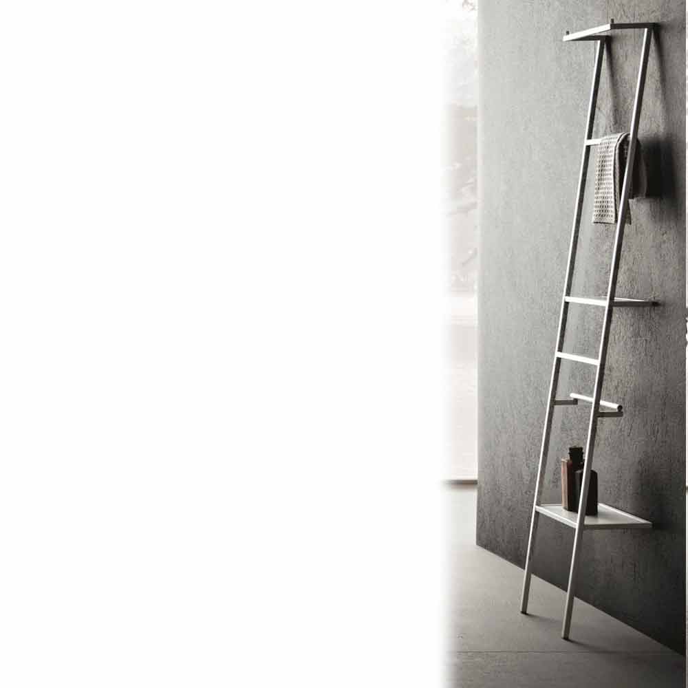 Escada suspensa em metal pintado mate de desenho minimalista e extremamente funcional. Está equipado com prateleiras, ganchos para roupões de banho, barras de enrolar e toalheiros.