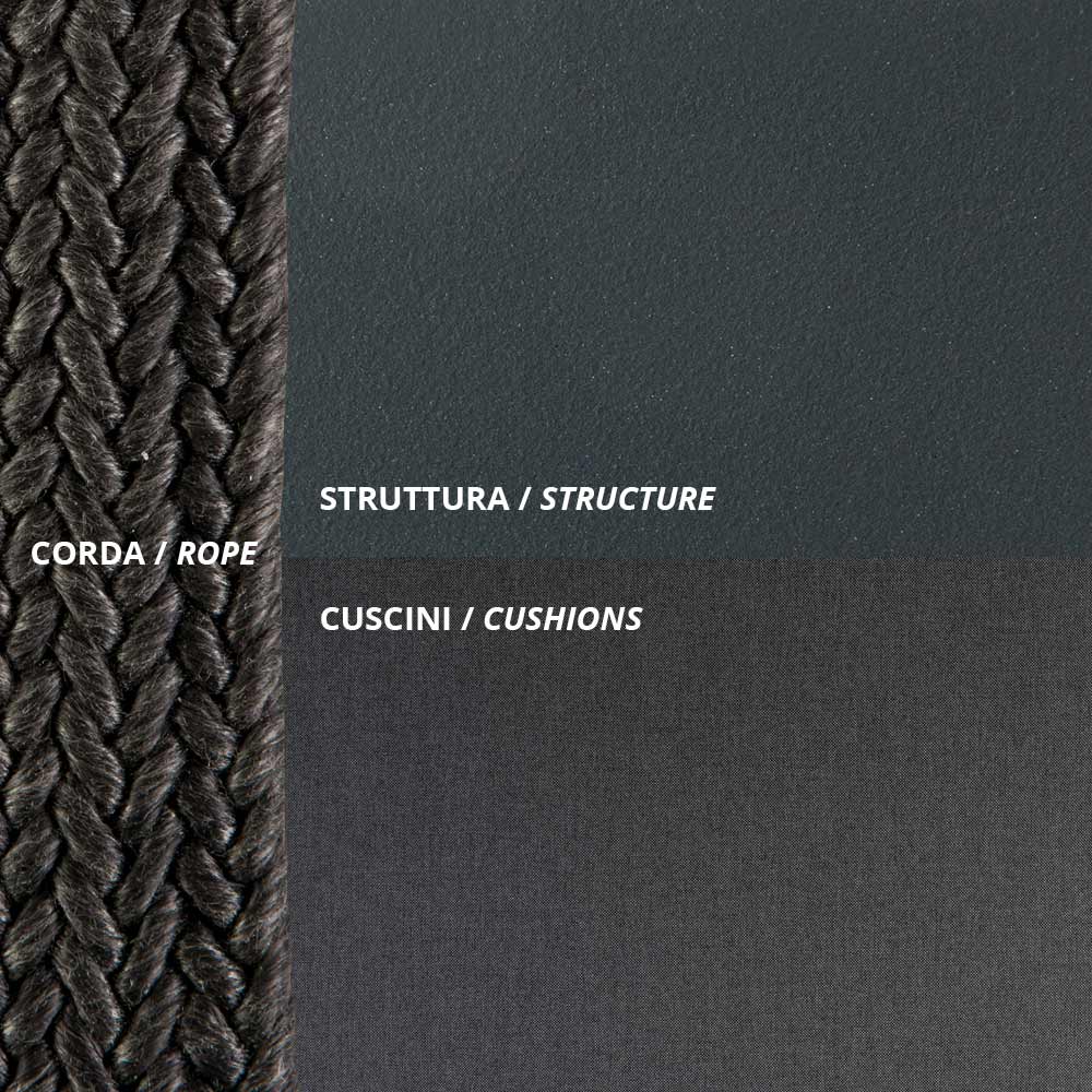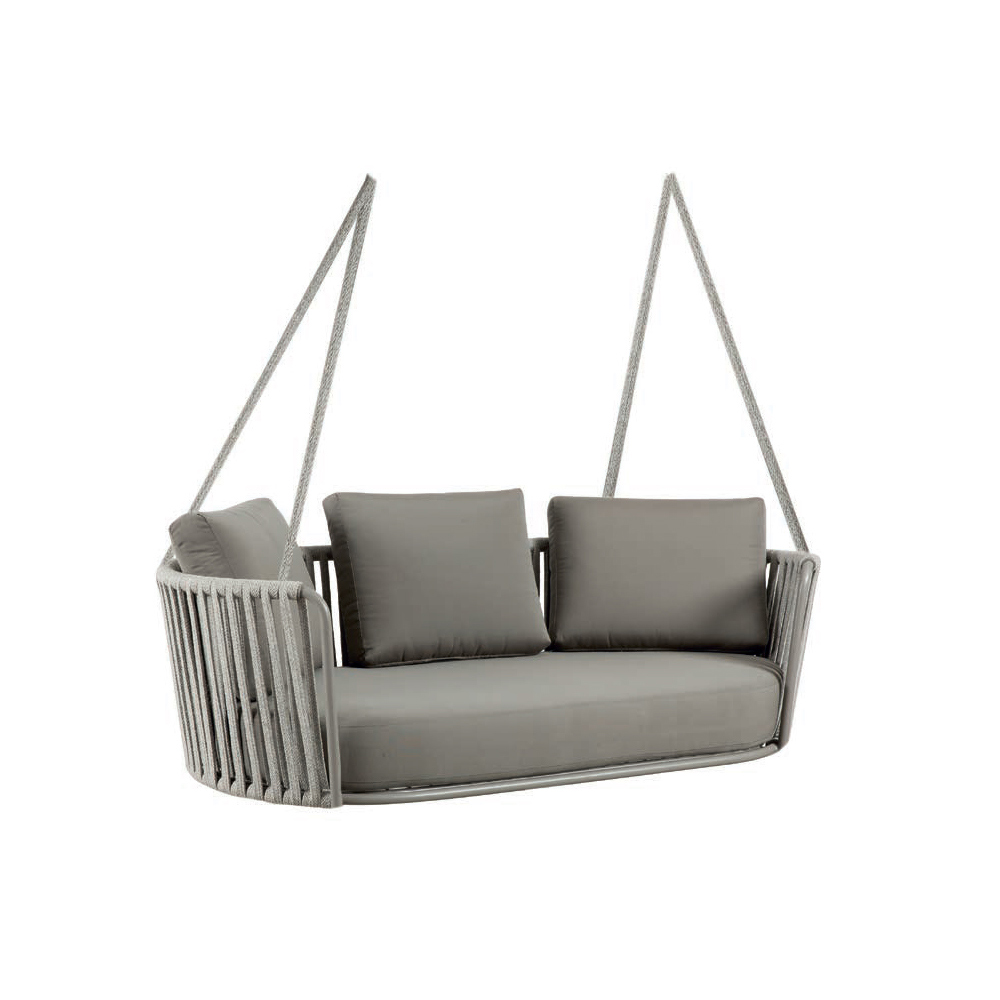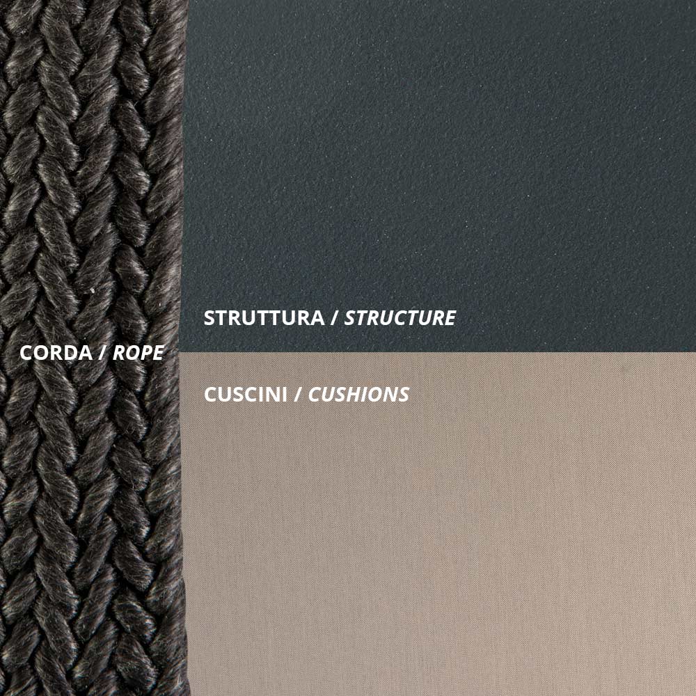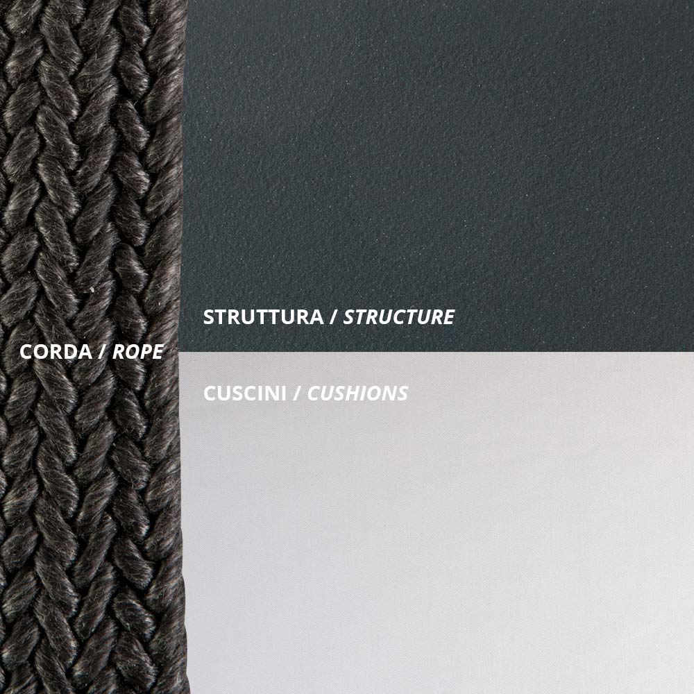 Balanço para área externa de 2 lugares em ferro galvanizado com revestimento em pó e corda com assento de tecido. Fabricado na Itália.