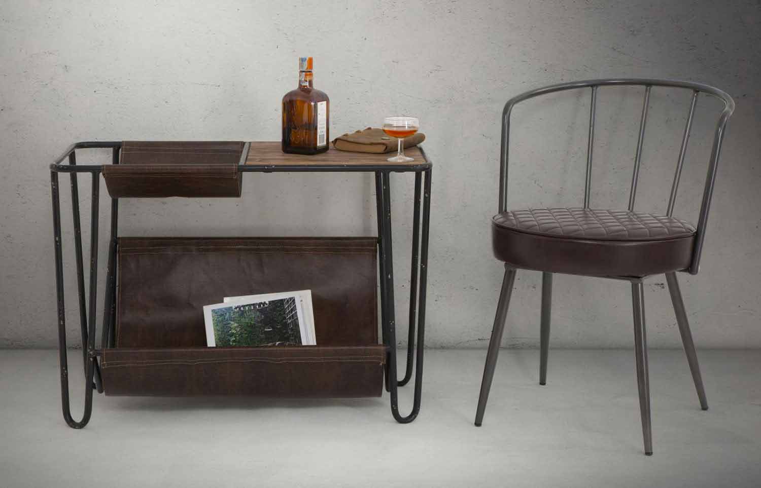 Poltrona de design industrial moderno em ferro e couro ecológico.