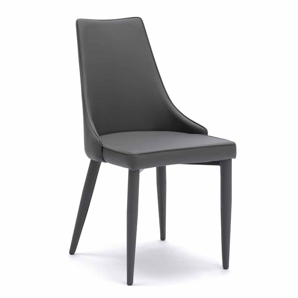 Cadeira com estrutura metálica totalmente forrada em imitação de couro cinza escuro.