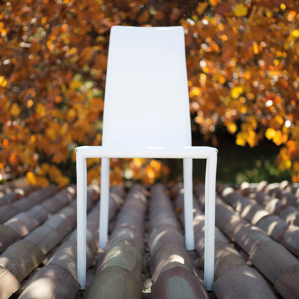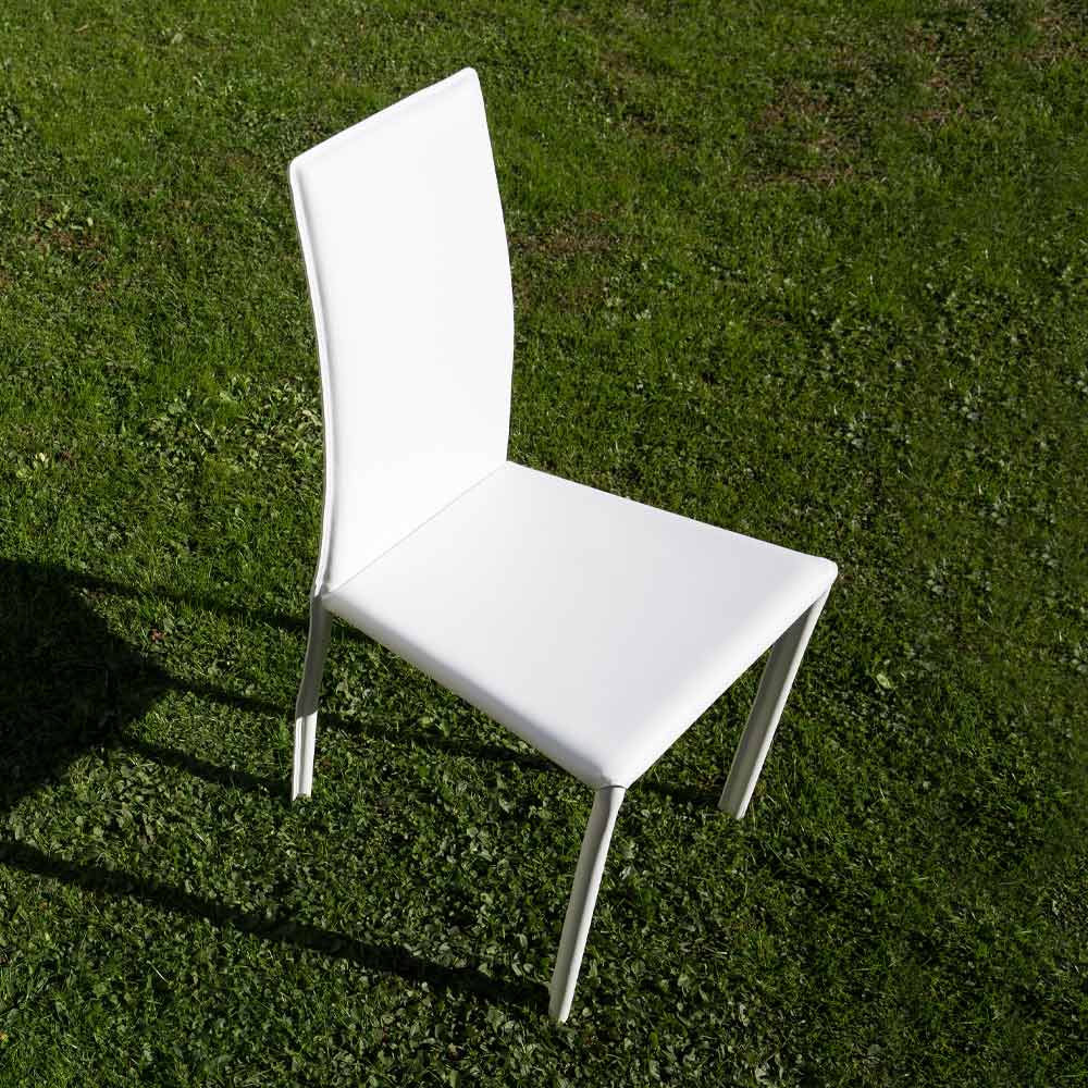 Cadeira de jantar inteiramente fabricada na Itália, totalmente revestida em couro branco e estrutura com perna redonda de ø 22 mm.