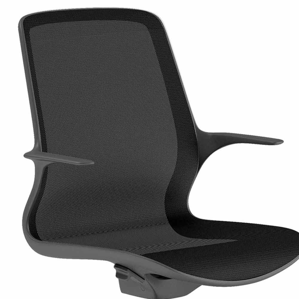 Cadeira giratória de escritório com braços fixos revestidos em malha preta e estrutura de nylon preta.