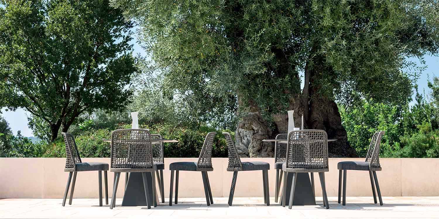 Emma é uma cadeira de jardim caracterizada por uma estrutura de fibra sintética tecida à mão com um quadro de alumínio revestido a pó cinza escuro .